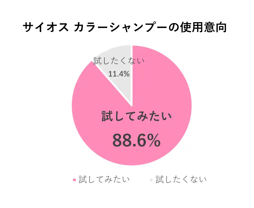 | 近年、白髪ケアへの関心が高まる中、カラーシャンプーとカラートリートメントをあわせて使う動きが広がっており、カラートリートメント使用者の約58%がカラーシャンプーを「使用したことがある」と回答しています。(図2)また、事前調査では、サイオス カラートリートメントの使用者および使用意向者の約88%が「サイオス カラーシャンプーを試してみたい」と回答しました。(図3)。これらの結果から、白髪ケアのライン使いへの期待が今後さらに高まることがうかがえます。 | |||