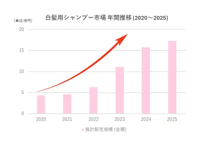 | 白髪用カラーシャンプー市場は、2020年の約4.3億円から2025年には約17.3億円へと拡大し、5年間で約4倍の成長を示しています。(図1)簡便性ニーズの高まりを背景に、手軽に白髪ケアを取り入れられるカラーシャンプーへの支持が拡大しており、今後も利用者層の広がりが期待されています。 | |||