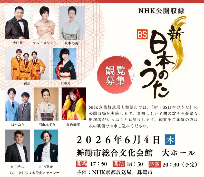 舞鶴市は、NHK京都放送局との共催により、令和8年6月4日(木)に舞鶴市総合文化会館にて「新・BS日本のうた」の公開収録を実施いたします 。演歌・歌謡界を代表する歌手によるステージの観覧申し込みを受け付けます。 |