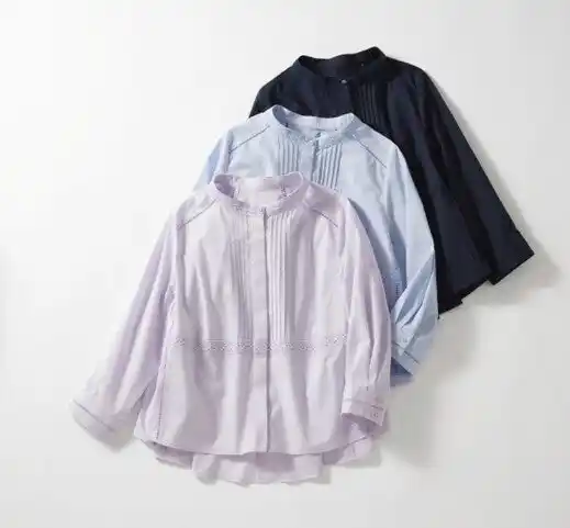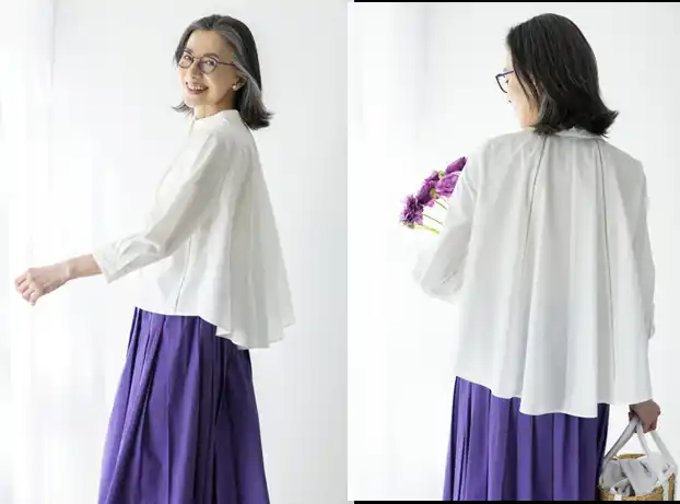 シニア女性が重視する「清潔感」を保つため、ハリのある綿混素材を採用しました。高級感がありながら、洗濯機洗いが可能で、シワになりにくく、アイロンの手間も軽減。きちんとした印象もキープします。 |