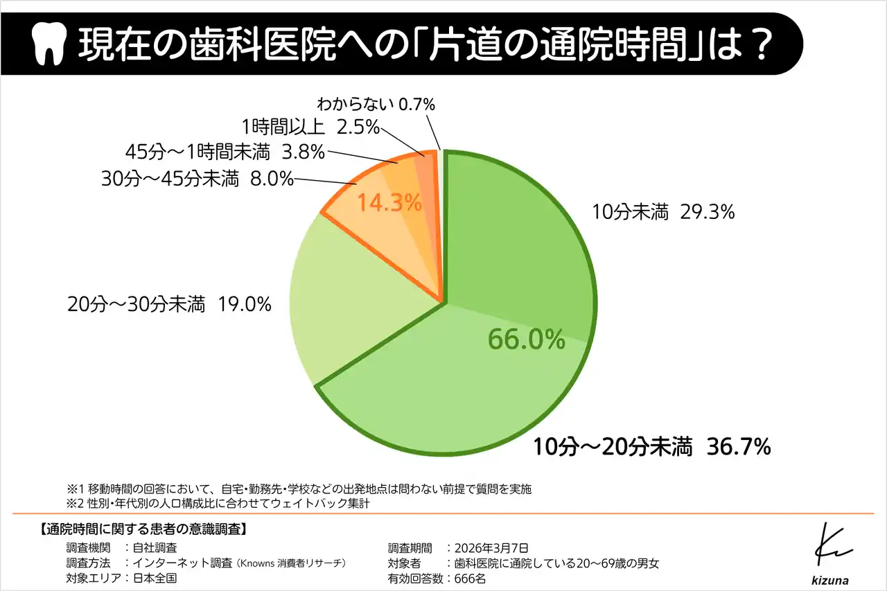 1.歯科医院への通院時間は「片道20分未満」が66.0%、「片道30分以上」の遠い医院に通う層は14.3% |