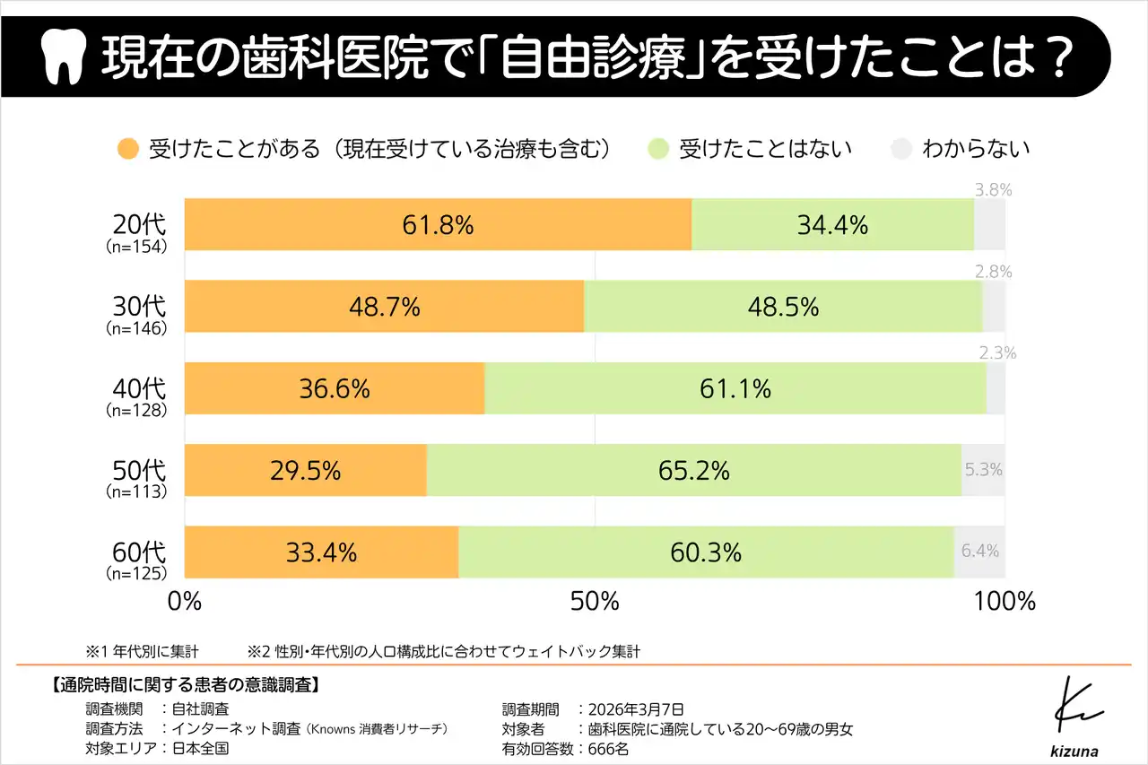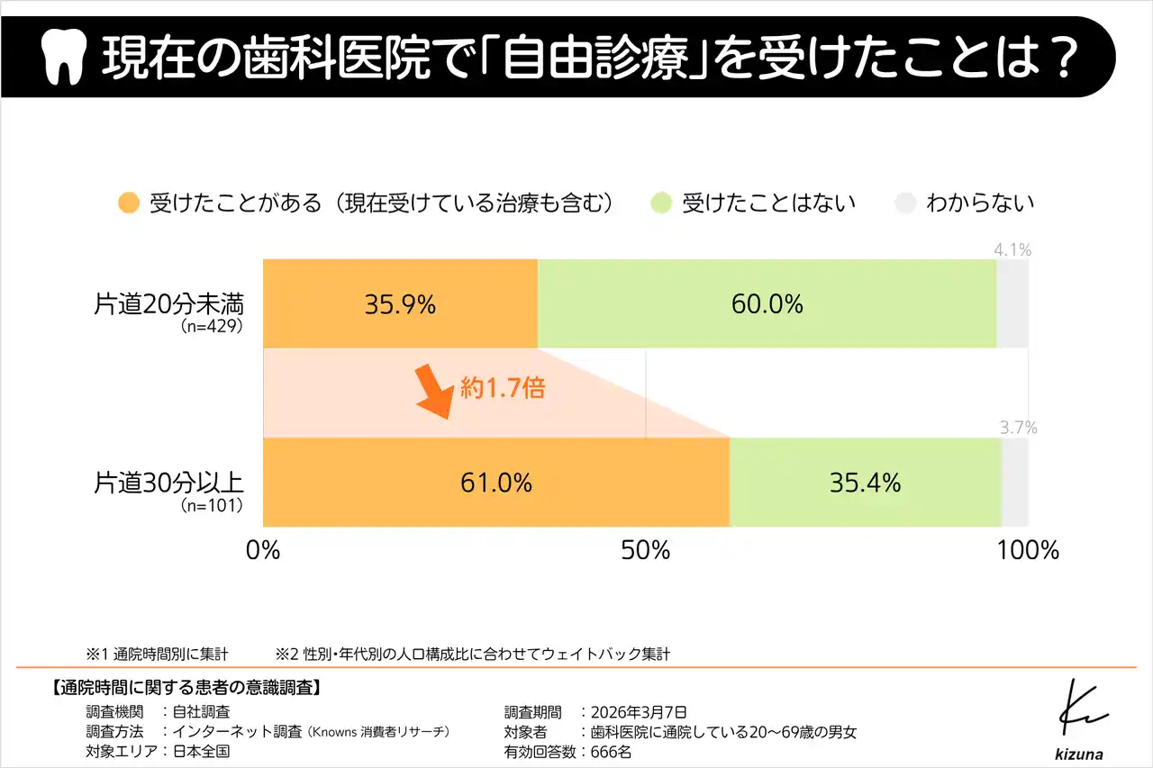 そこで、患者さまとの対話を重視し、予防歯科から審美治療まで幅広い歯科医療を提供する『医療法人きずな きずな歯科クリニック』( https://www.kizna-dc.com/ )(所在地:兵庫県神戸市北区、院長:水野貴文)は、通院にかけている時間と歯科医院選びの関係を把握するため、全国の20~69歳の男女666名を対象に調査を実施しました。 |