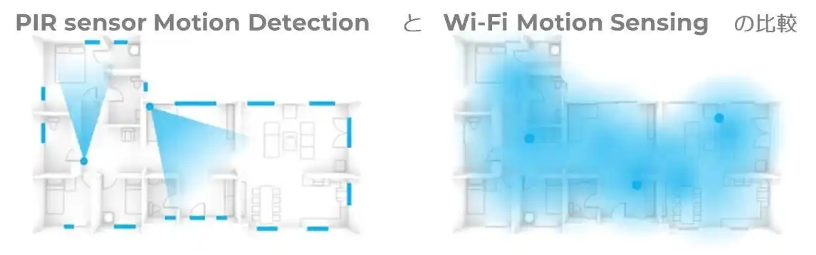 モーションは他のセンシング(PIRセンサーなど)より広い範囲をカバーし、ペットやロボット掃除機をフィルタリングします。PIRやレーダーよりも広い範囲で人の動きを検出します。 |