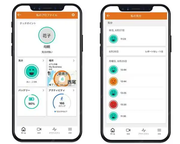 離れて暮らす、大切な人の気分・位置・活動レベル・スマートフォンの電池残量が把握できる見守りアプリ ios、androidどちらのデバイスにも対応しております。 |