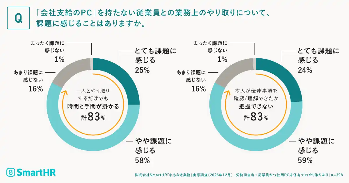 これらの手段に対し、83%の担当者が「一人とやり取りするだけでも時間と手間がかかる」課題を感じており 、さらに「本人が内容を確認・理解できたか把握できない」と感じる割合も83%に達しています。 |