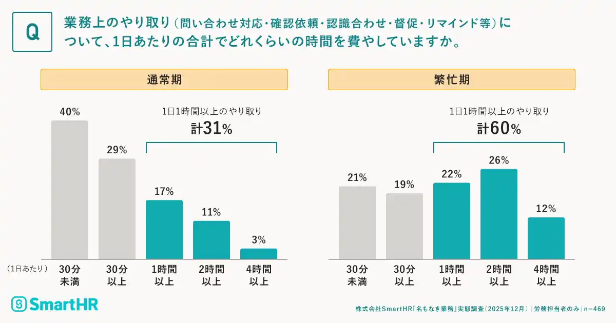 繁忙期、担当者の約6割が「1日1時間以上」を従業員とのやり取りに費やす |