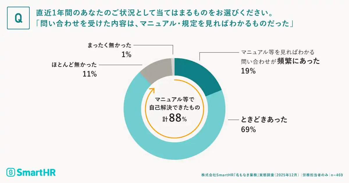 労務担当者が受ける問い合わせのうち、計88%が「マニュアルや規定を見ればわかる」内容でした。 |