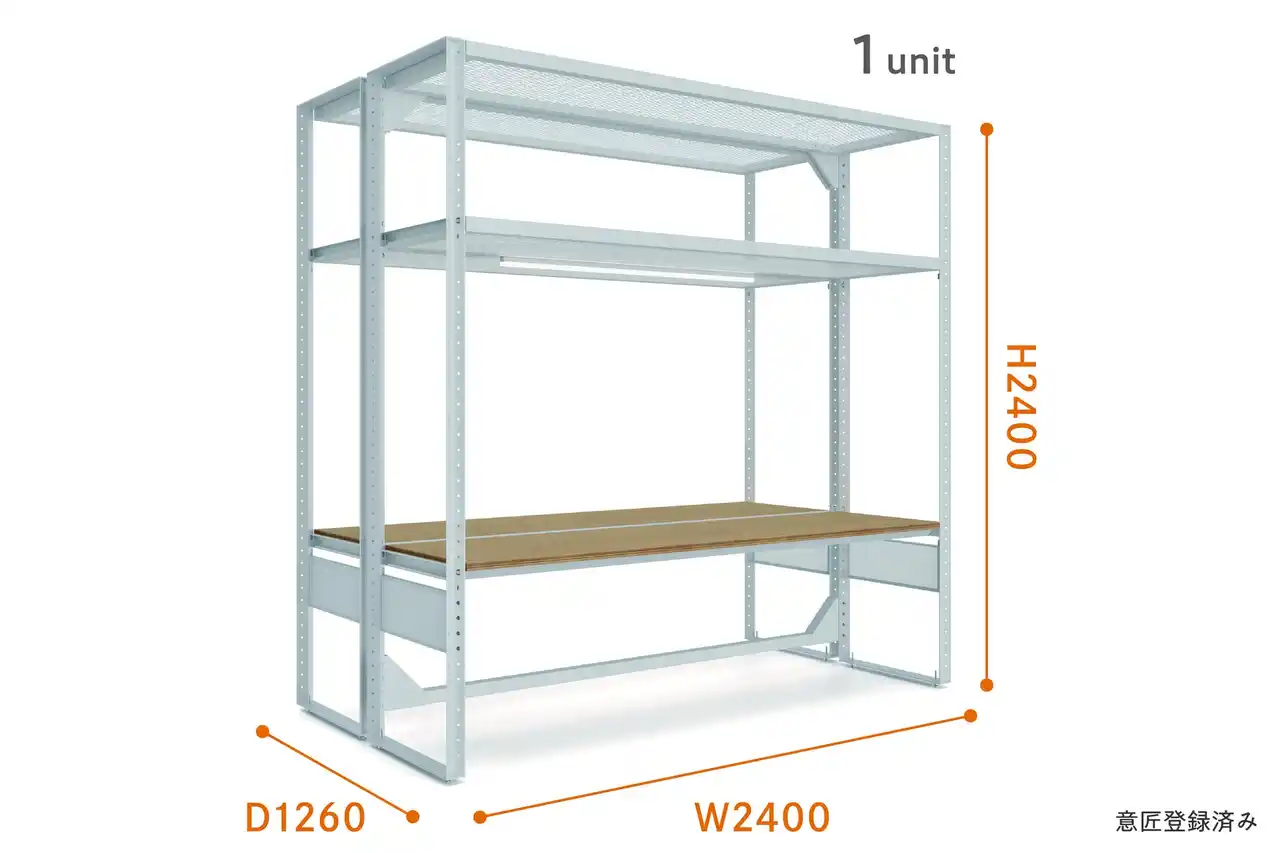 ・抜け感:W2400という大きなスパンとメッシュ棚により、視線や光、空気が通り抜けます。これにより、個人の集中を守りながらも、周囲の気配を感じられる「程よい距離感」を生み出します。 |
