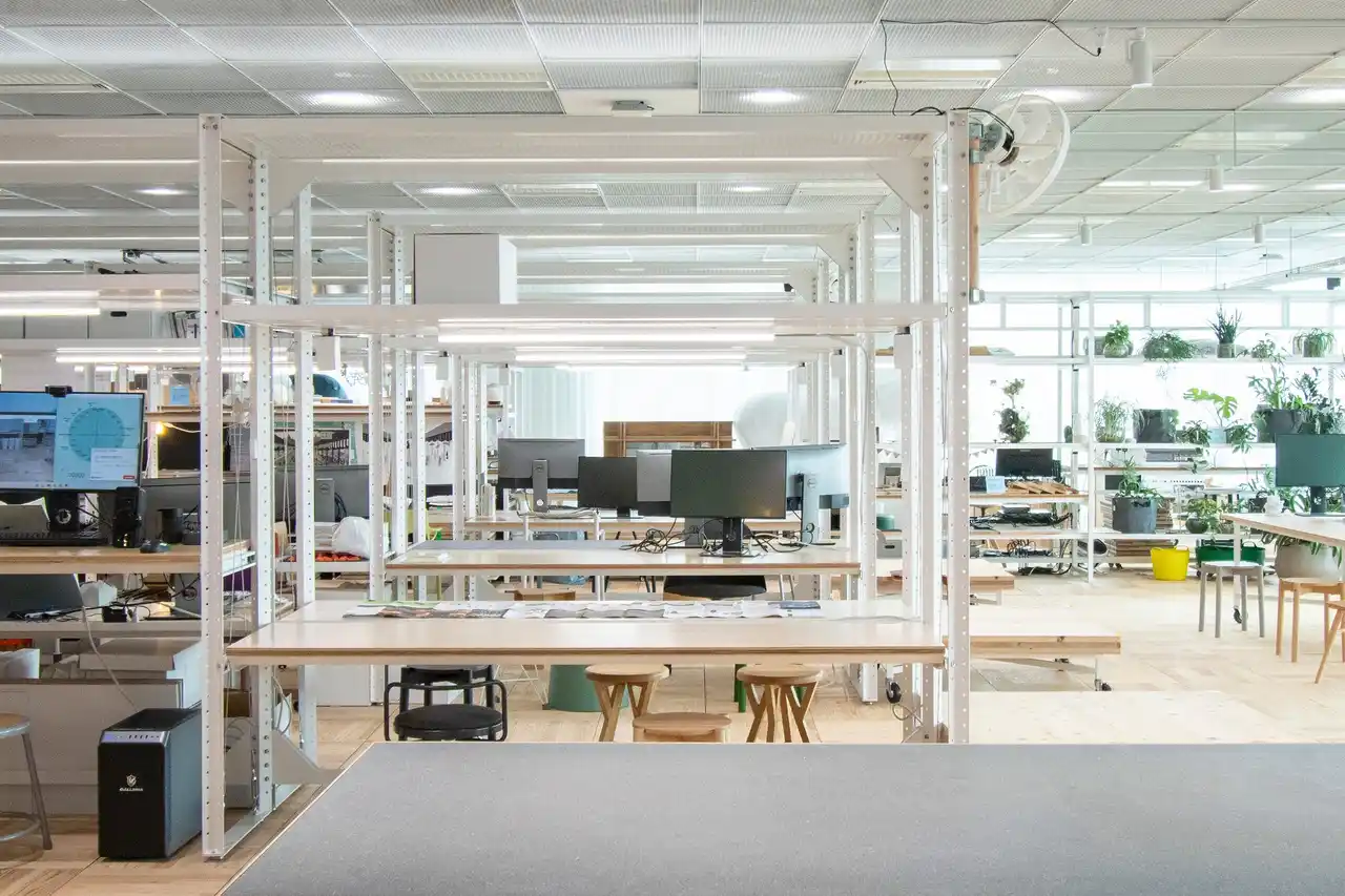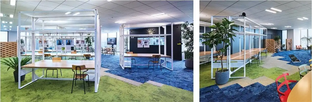 本プロジェクトは、乃村工藝社の社内研究開発組織「未来創造研究所」の事業として始動しました。同研究所では、未来のオフィス像をリサーチする中で、組織の成長や活動内容の変化、働く場の多様化に伴い、オフィスの運用改善や改修への投資が発生している現状に着目。こうした時代の変化を背景に、現代のオフィスに求められるのは、人が自然と集まりたくなる「場(プレイス)」を生み出すことであり、そのためには、変化に対応するためユーザー自身の手で空間を再構成できる可変性が、オフィスには不可欠であると考えました。 |