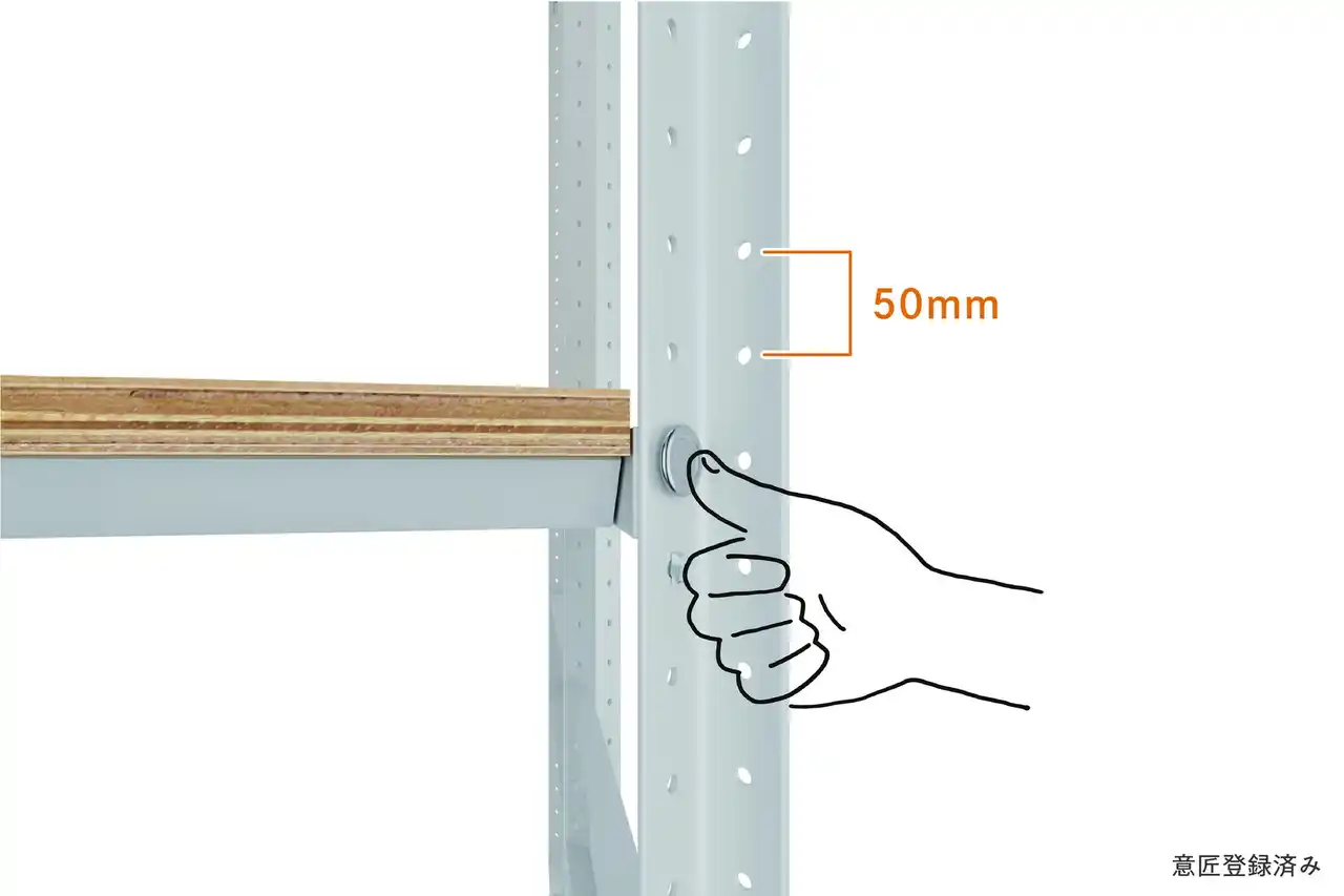 従来、業務用什器の棚板変更には専門業者の手配や工具が必要でした。「KICHI+」はオリジナルのスナップボタン方式を採用し、ボタンを外すことでユーザー自身が手軽に高さを変更できます。また、50mmピッチでの調整にも対応。使用環境や用途の変化に柔軟に対応します。 |