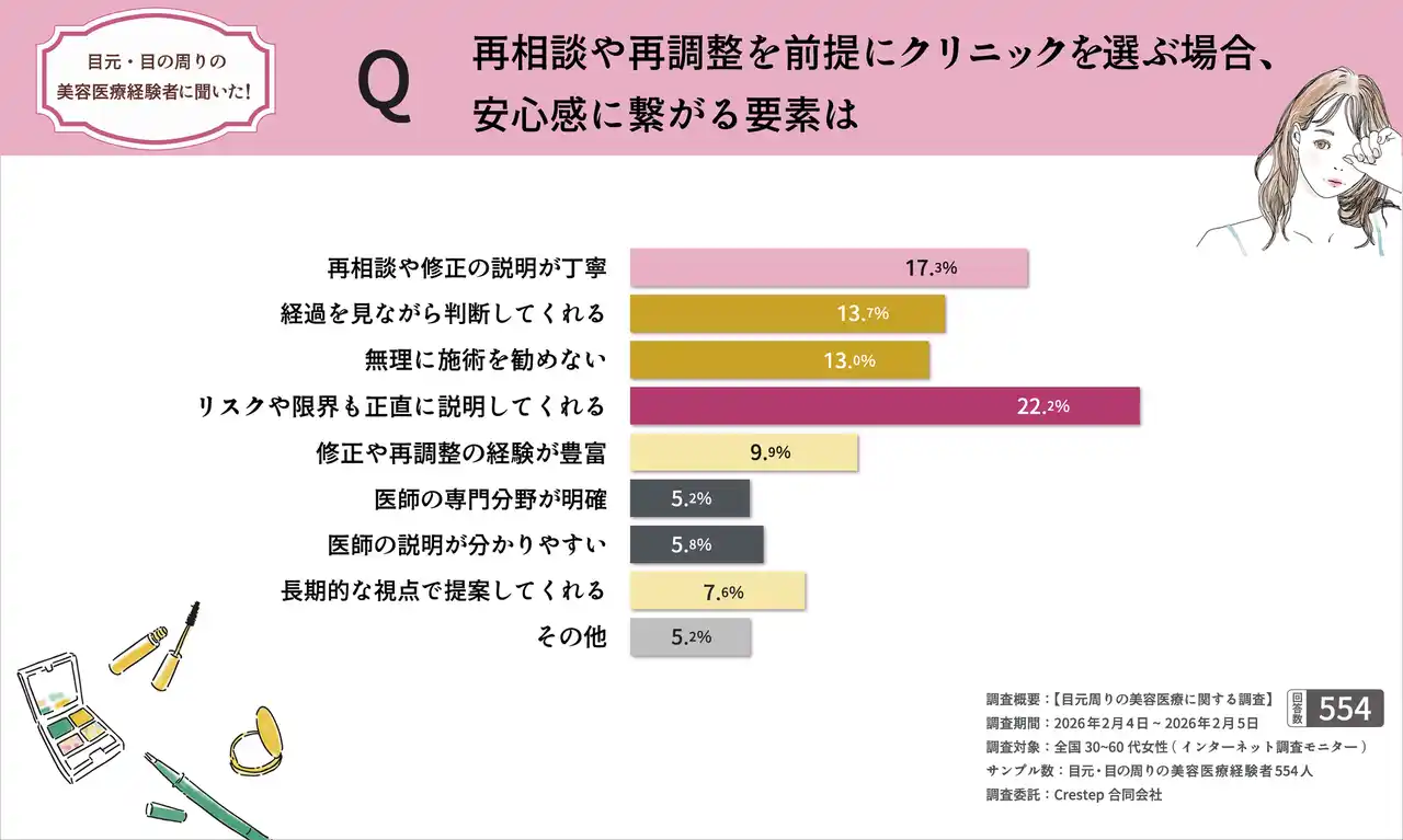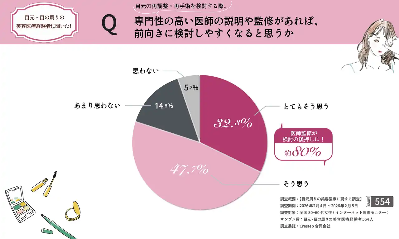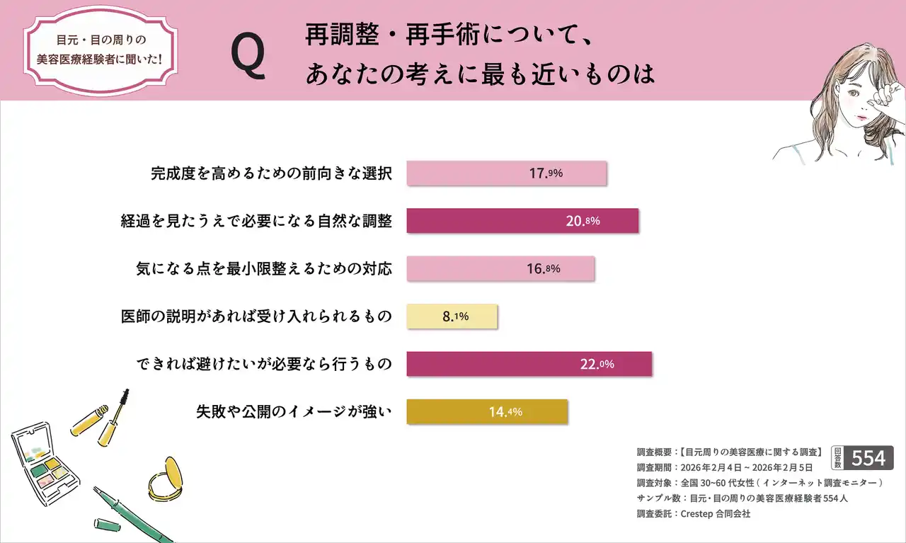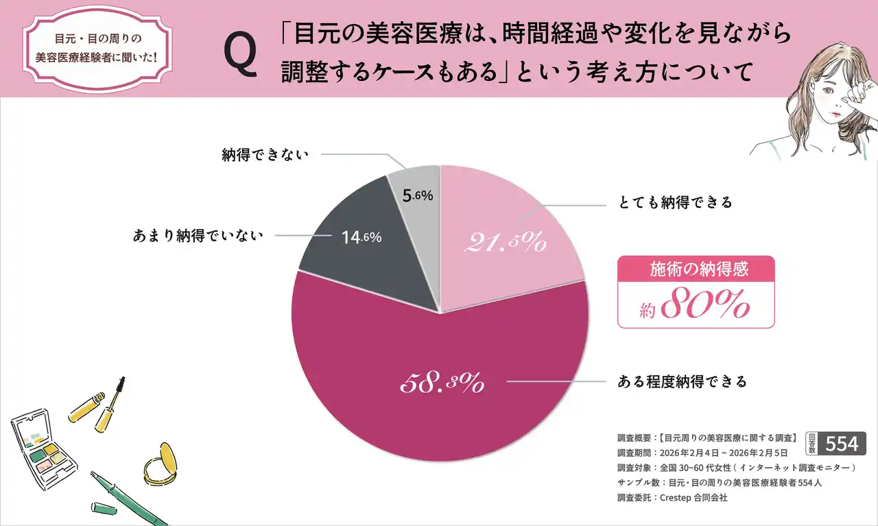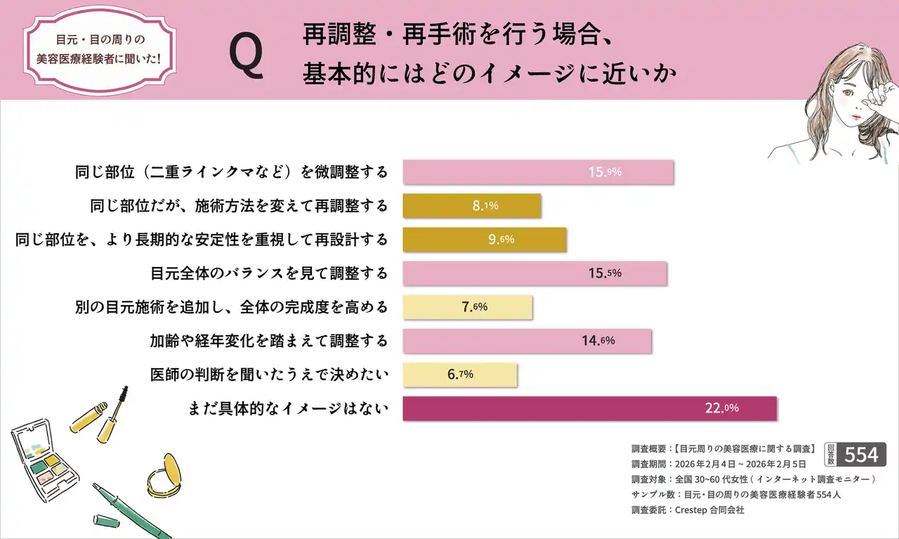 調査名:【目元周りの美容医療に関する調査】 調査期間:2026年2月4日~2026年2月5日 調査対象:全国/30~60代/女性(インターネット調査モニター) 有効回答数:目元・目の周りの美容医療経験者554人 調査実施:Crestep合同会社 |