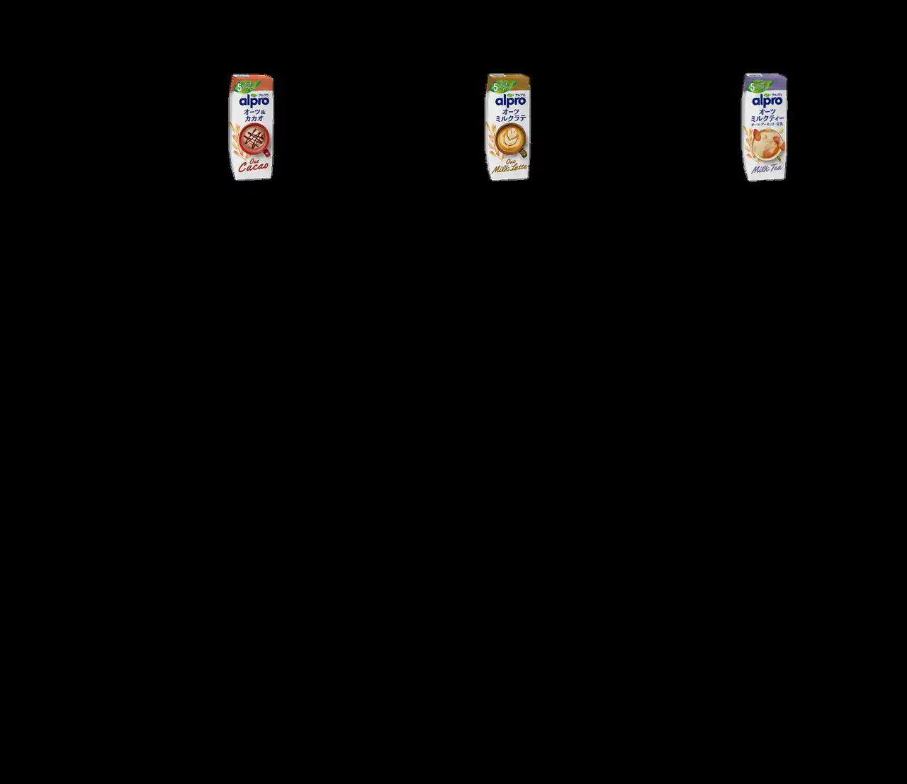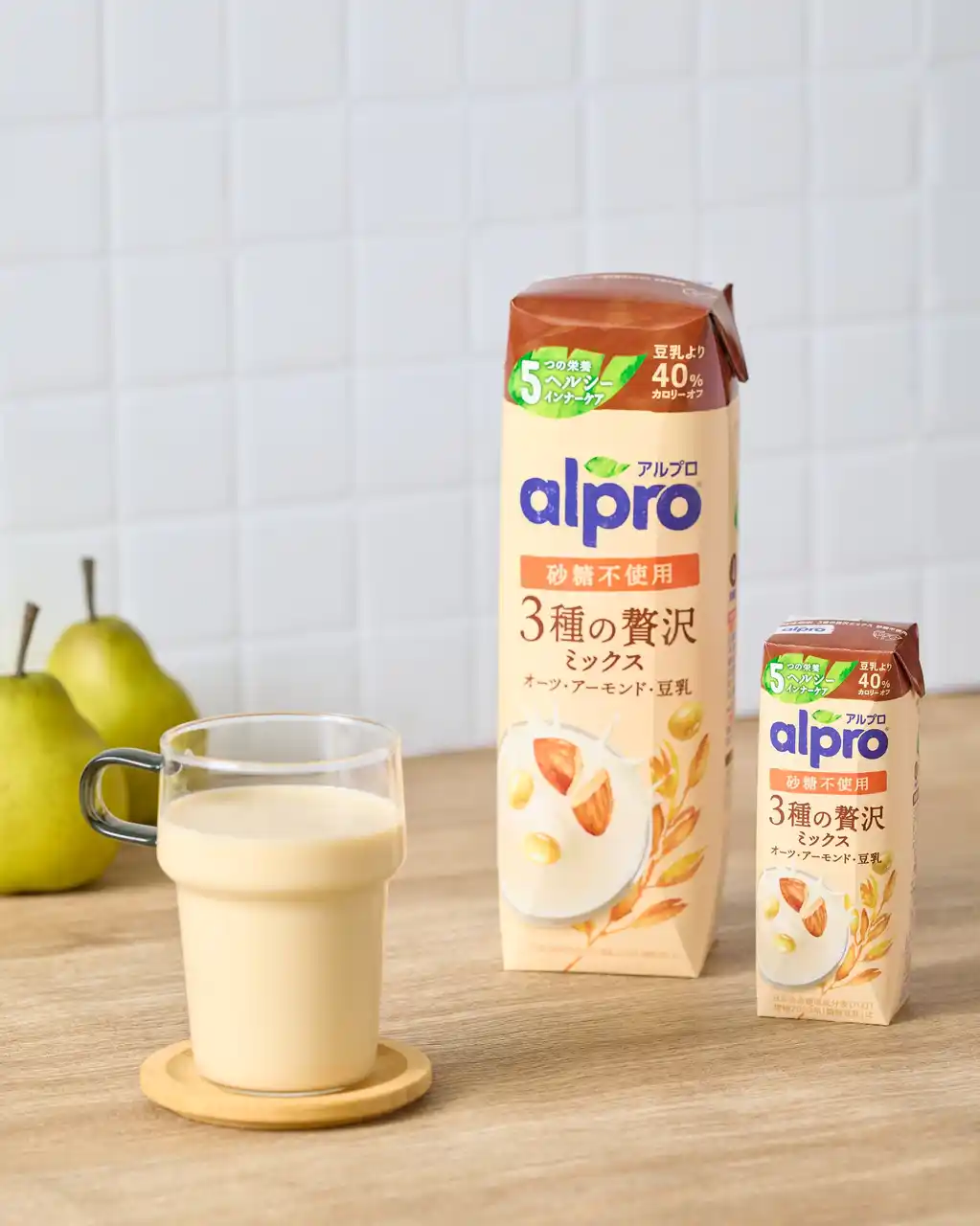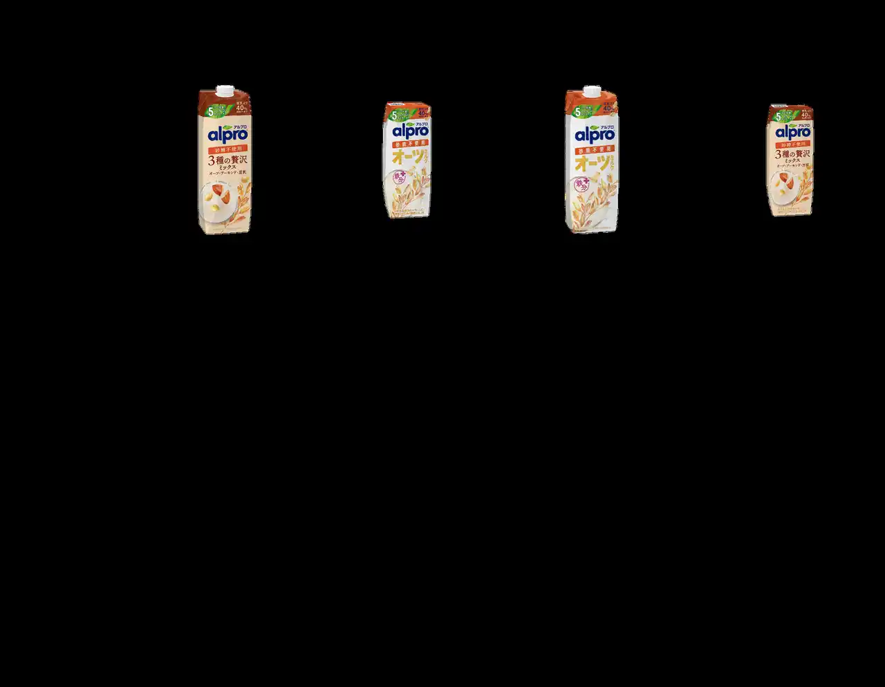 砂糖不使用」を発売。2022年に飲み切りサイズ(250ml)のフレーバータイプ、2025年にはオーツミルク・アーモンドミルク・豆乳をブレンドした「3種の贅沢ミックス」シリーズを展開し、幅広い方々に植物性ミルクを楽しんでいただけるよう、ラインナップを拡大してきました。アルプロ製品の大きな特長はその栄養の豊富さにあります。アルプロの「オーツミルク」1杯(250ml)には、食物繊維 3.0g~3.8g、鉄分 1.2mg、カルシウム 360mgが含まれており、「3種の贅沢ミックス」1杯では、食物繊維・ビタミンE・カルシウム・イソフラボン・ビタミンB2の5つの栄養素を一度に摂取することができます。 |