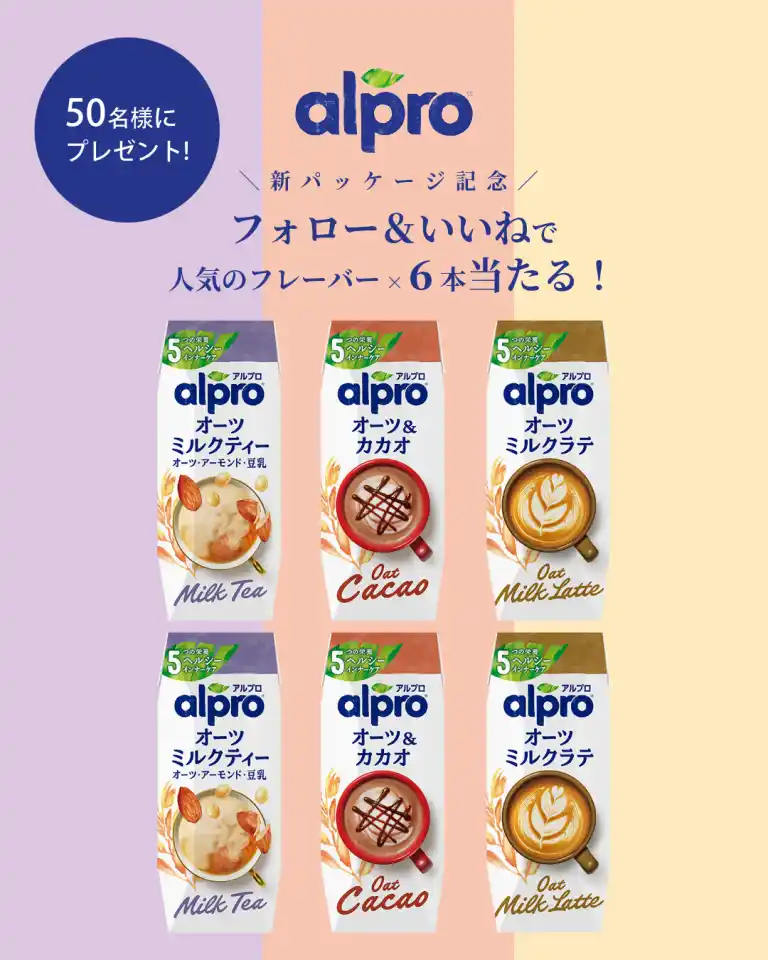 新パッケージで生まれ変わったアルプロの発売を記念し、4月8日より公式Instagramアカウントにてプレゼントキャンペーンを実施します。公式アカウントをフォローのうえ、対象投稿に「いいね」していただいた方の中から、抽選で50名様に新パッケージの「オーツ&カカオ」「オーツミルクラテ」「3種の贅沢ミックス ミルクティー」を各2個ずつセットでプレゼント。 この春、 アルプロで “無理なくおいしく続けられるヘルシーインナーケア” を習慣にしてみてはいかがでしょうか。キャンペーンの詳細はアルプロ公式アカウントをご確認ください。 |