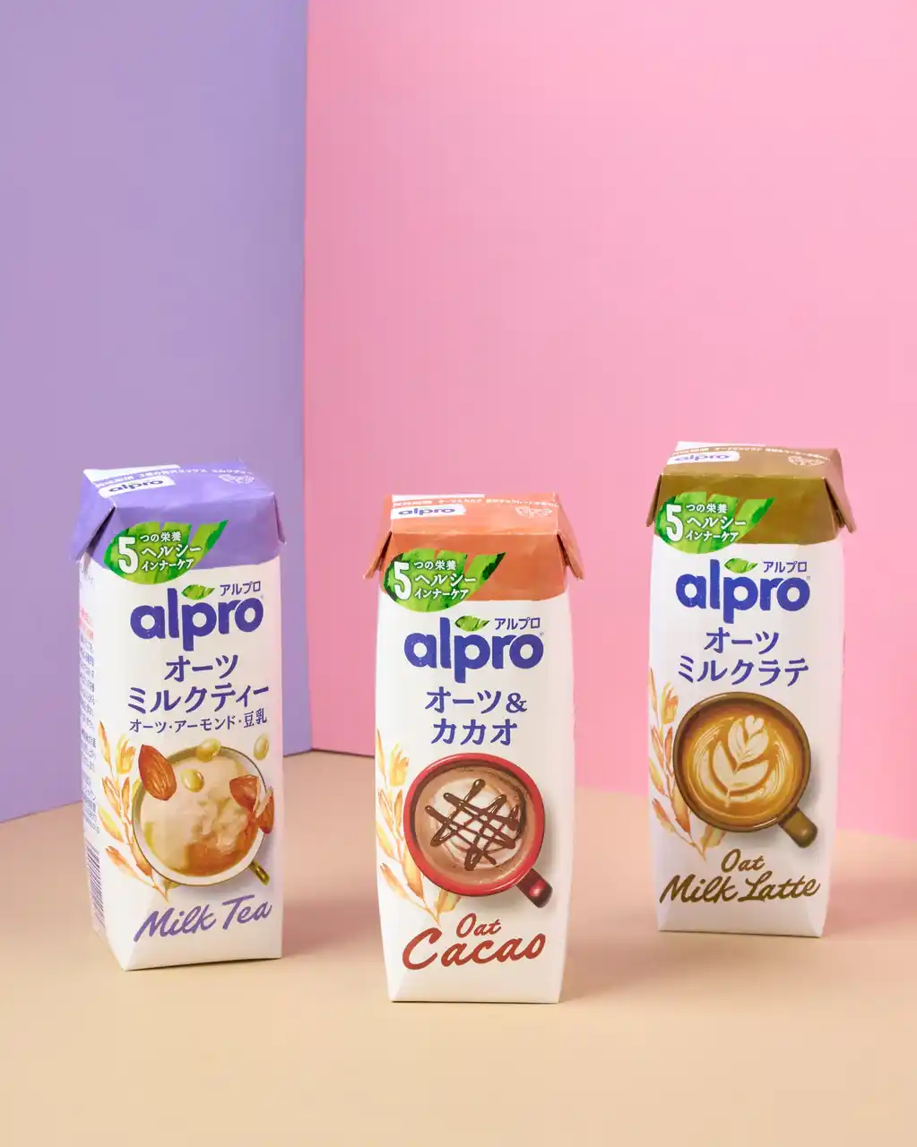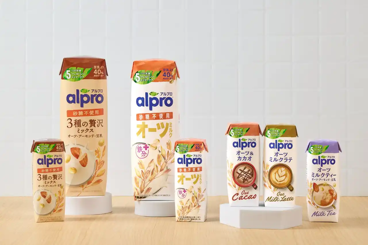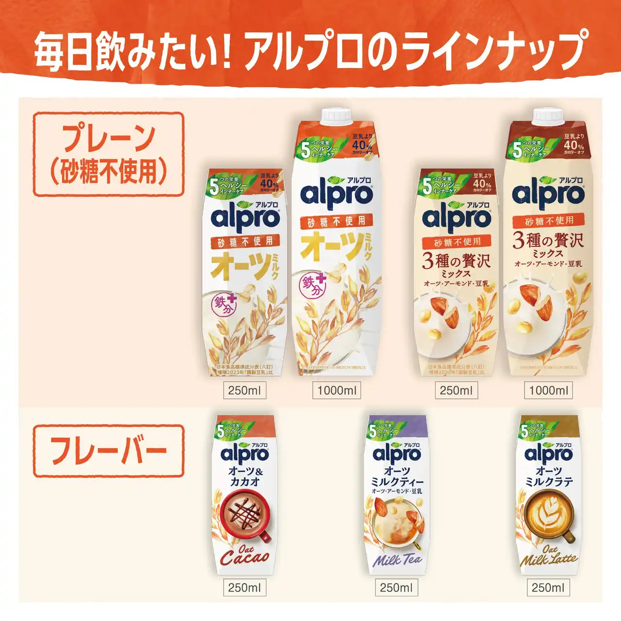 アルプロは1980年にベルギーで誕生した、オーツ麦や大豆など植物由来の食品を手掛けるブランドです。日本では、2020年に発売した「オーツミルク 砂糖不使用」を皮切りに、2022年に飲み切りサイズ(250ml)のフレーバータイプ、2025年にはオーツミルク・アーモンドミルク・豆乳をブレンドした「3種の贅沢ミックス」シリーズを展開。幅広い方々に様々な味わいで植物性ミルクを楽しんでいただけるよう、ラインナップを拡げてきました。 |