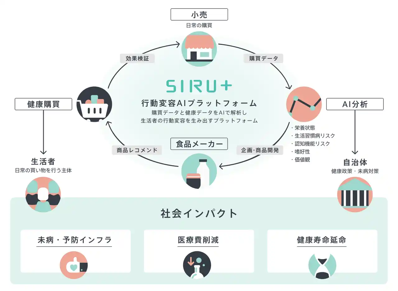 | シルタスは、スーパーなどの購買データをもとに、食生活・栄養状態・購買行動の特徴を解析し、個人に最適化された行動提案を行うヘルスケアプラットフォーム「SIRU+」を開発しています。 | |||