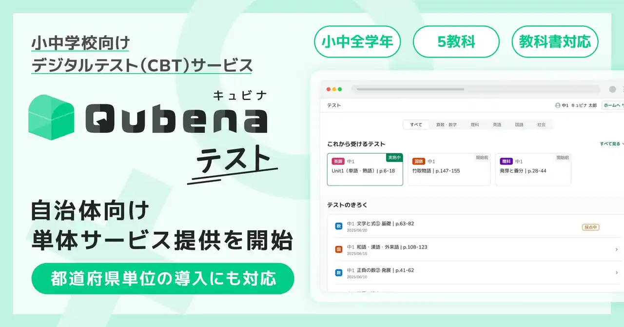 学習eポータル+AI型教材「キュビナ」を開発・提供する株式会社COMPASS(本社:東京都文京区、代表取締役:佐藤 潤、以下 COMPASS)はこのたび、小中学校向けデジタルテスト(CBT)サービス「キュビナ テスト」について、学習eポータル+AI型教材「キュビナ」の導入有無にかかわらずご利用いただける、単体サービスとしての提供を2026年度より開始することをお知らせします。対象は自治体で、都道府県単位での導入も可能です。また、自治体独自の問題搭載への対応も予定しており、「キュビナ テスト」上で自治体の学力調査等を実施いただくことが可能になります。