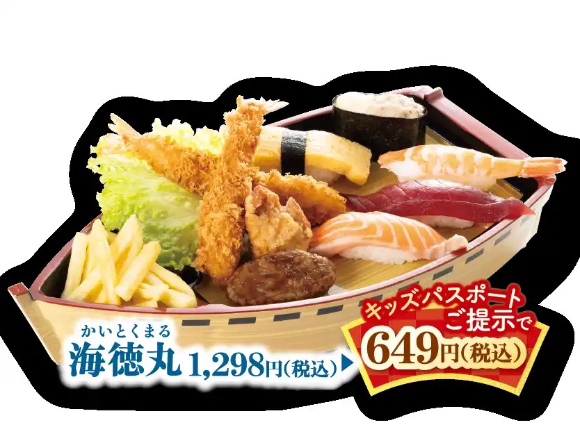 にぎりの徳兵衛の「徳」と、海鮮アトムの「海」から名付けた、その名も「海徳丸(かいとくまる)」は、大海原に出航する船の形をした器を使用。お子様に人気の寿司ネタと鶏の唐揚げ、エビフライ、ポテトフライなど人気の揚げ物などを盛り合わせました。 |