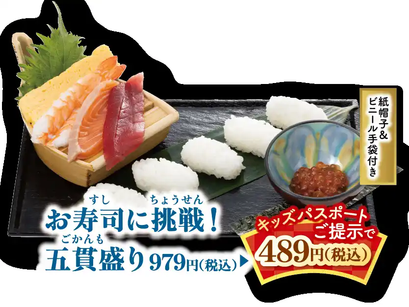 ・お寿司に挑戦!五貫盛り 979円 →キッズパスポートご提示で489円 |