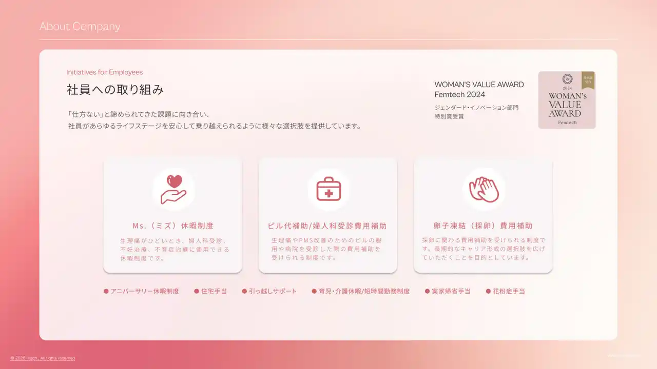 ・Ms.休暇制度(生理痛・婦人科受診・不妊治療・不育症治療などに対応) ・婦人科受診費用およびピル代の補助制度 ・卵子凍結費用の補助 |