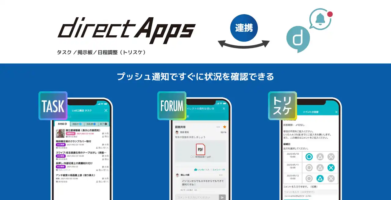 株式会社L is B(エルイズビー、本社:東京都千代田区、代表取締役社長CEO:横井 太輔、以下「L is B」)が開発・提供する現場向けビジネスチャット「direct/ダイレクト」は、株式会社大林組(本社:東京都港区、代表取締役社長 兼 CEO:佐藤俊美、以下「大林組」)の建築・土木における国内すべての建設現場において、協力会社を含めたコミュニケーション基盤として活用されています。 このたび、大林組では2024年度より試行導入を進めてきた「direct Apps(タスク機能)」を、2025年12月より国内すべての建設現場で利用可能な環境を整えました。現在は、希望する現場を中心に本格活用が進められています。あわせて、外部システムと連携したチャットボットの活用により、重要通知の自動化や現場情報のリアルタイム共有を進めています。 |