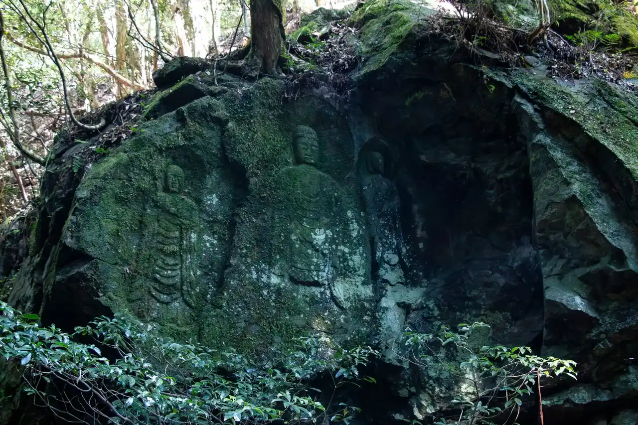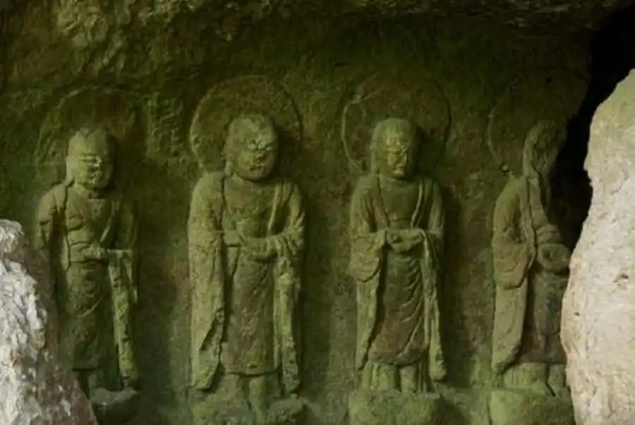 洞窟の壁面に彫られた石仏群「春日山石窟仏」は国指定の史跡となっている |