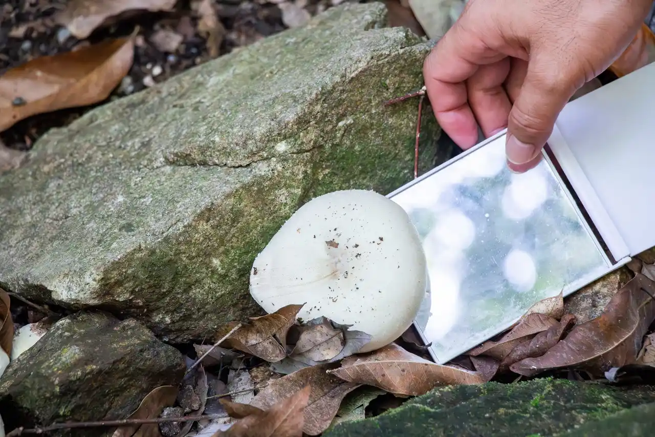 「キノコが生えていますね、ちょっと裏側を見てみましょうか。採取してはいけないので、鏡を使って……」。 |