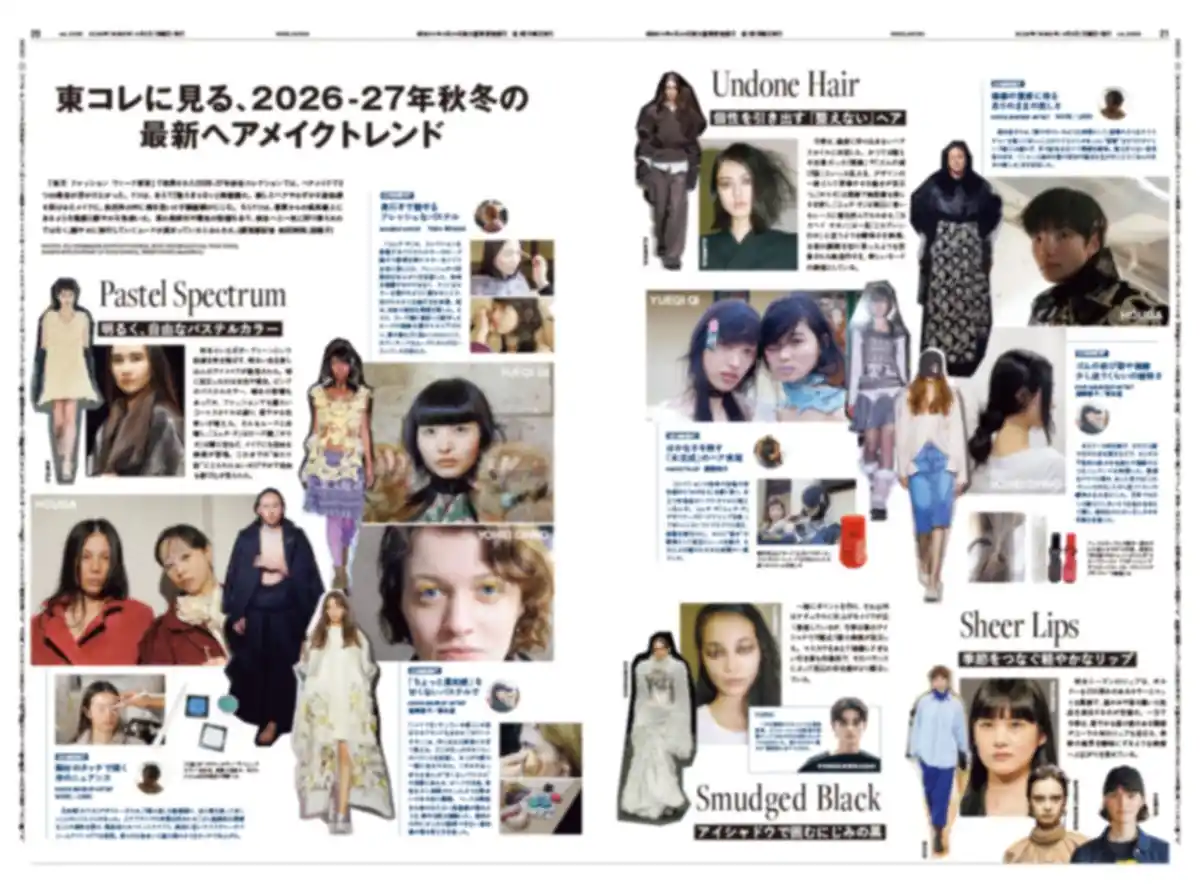 今週は特集だけじゃありません。東コレからみた2026-27年秋冬のヘア&メイクトレンドのほか、最終ページの名物連載「ファッション&ビューティ パトロール」では、3月に文化服装学院を卒業したばかりの超話題のデザイナー「デッドボーイ」の直撃インタビューを掲載しています。SNSの辛口投稿でも知られる西脇駆デザイナーとは何者なのか。コンテストを総ナメにする実力とは?必読です。 |