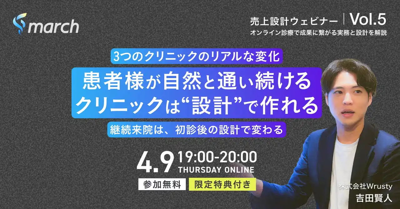 LINEを活用した集患と継続収益まで自動化することで、医療機関の “成果に責任を持つ” オンライン診療・集患オペレーションシステム「march」を展開する株式会社Wrusty(本社:東京都渋谷区、代表取締役:上田遼)は、全国の開業医・開業予定医の皆様を対象に、無料オンラインセミナー「3つのクリニックのリアルな変化:患者が自然と通い続ける医院は“設計”で作れる」を2026年4月9日に開催いたします。本セミナーでは、規模や診療科目の違うそれぞれの医療機関の成果に繋がったオンライン診療の動線設計と、なぜ「march」を活用している医療機関は1年間で9倍という収益に繋げることができているかを、再現性の高い設計という観点から解説します。