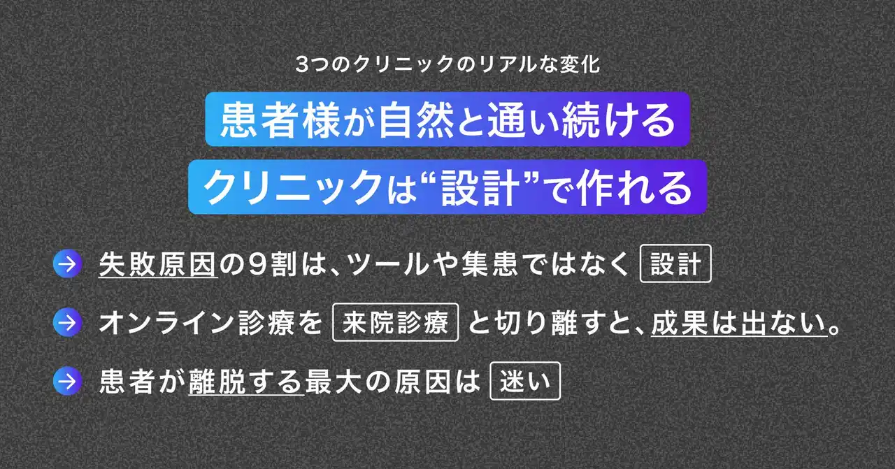 | その多くは、ツール選定や集患の問題ではなく、オンライン診療の“設計”そのものに原因があります。 | ||||||||||||||||||||||
