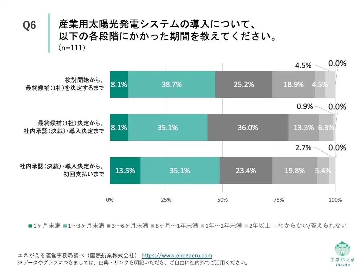 「Q6. 産業用太陽光発電システムの導入について、以下の各段階にかかった期間を教えてください。※「検討開始」は、社内で導入に向けた検討が正式に始まった時点を指します。 ※「導入決定」は、社内の決裁が完了し、導入実施が正式に決まった時点を指します。 ※「初回支払い」は、契約に基づく最初の支払い(着手金・初回請求等)を指します。」(n=111)と質問したところ、検討開始から、最終候補(1社)を決定するまでは「1~3ヶ月未満」が38.7%、最終候補(1社)決定から、社内承認(決裁)・導入決定までは「3~6ヶ月未満」が36.0%、社内承認(決裁)・導入決定から、初回支払いまでは「1~3ヶ月未満」が35.1%という回答となりました。 |