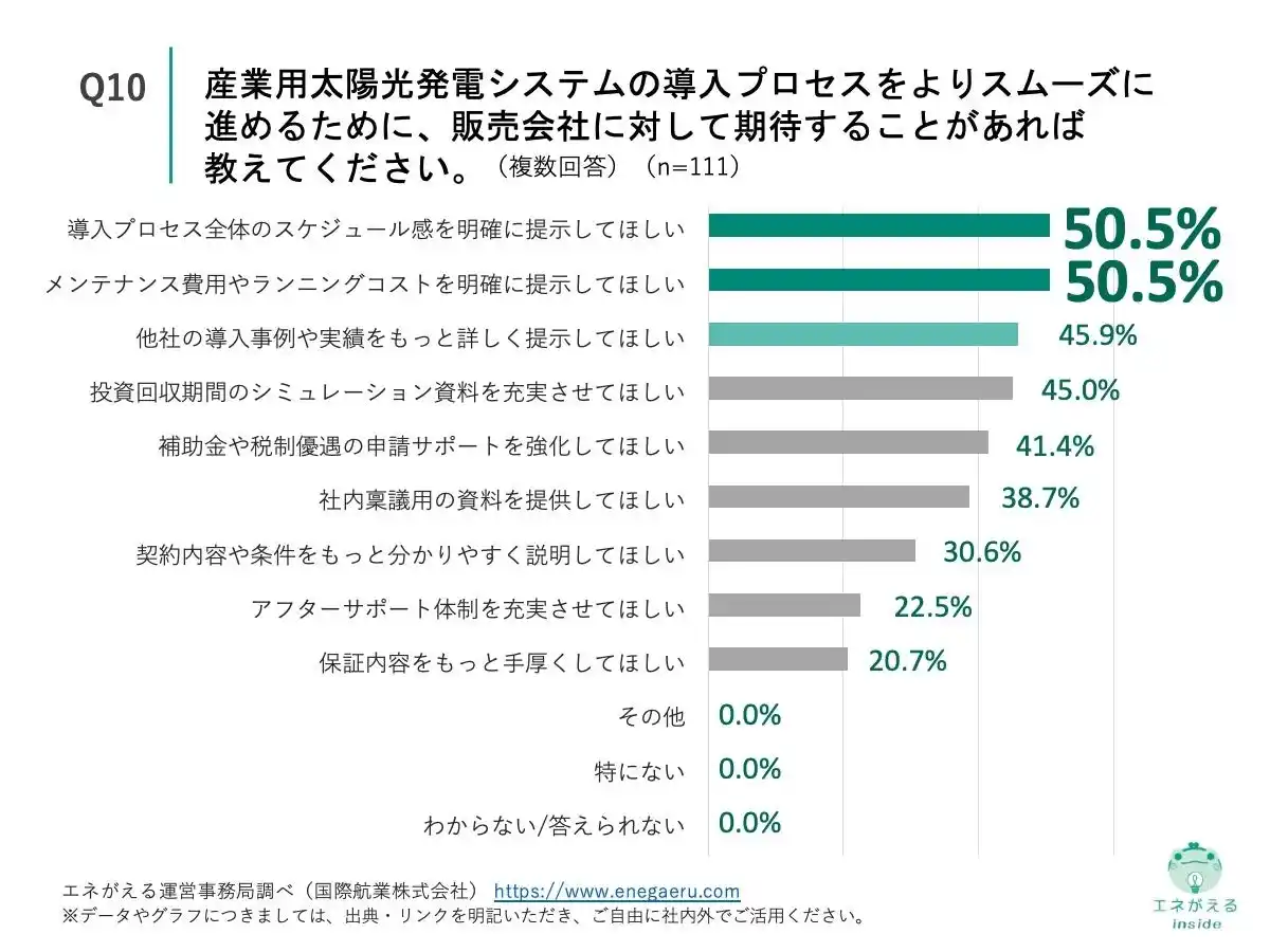 Q10. 産業用太陽光発電システムの導入プロセスをよりスムーズに進めるために、販売会社に対して期待することがあれば教えてください。(複数回答) |