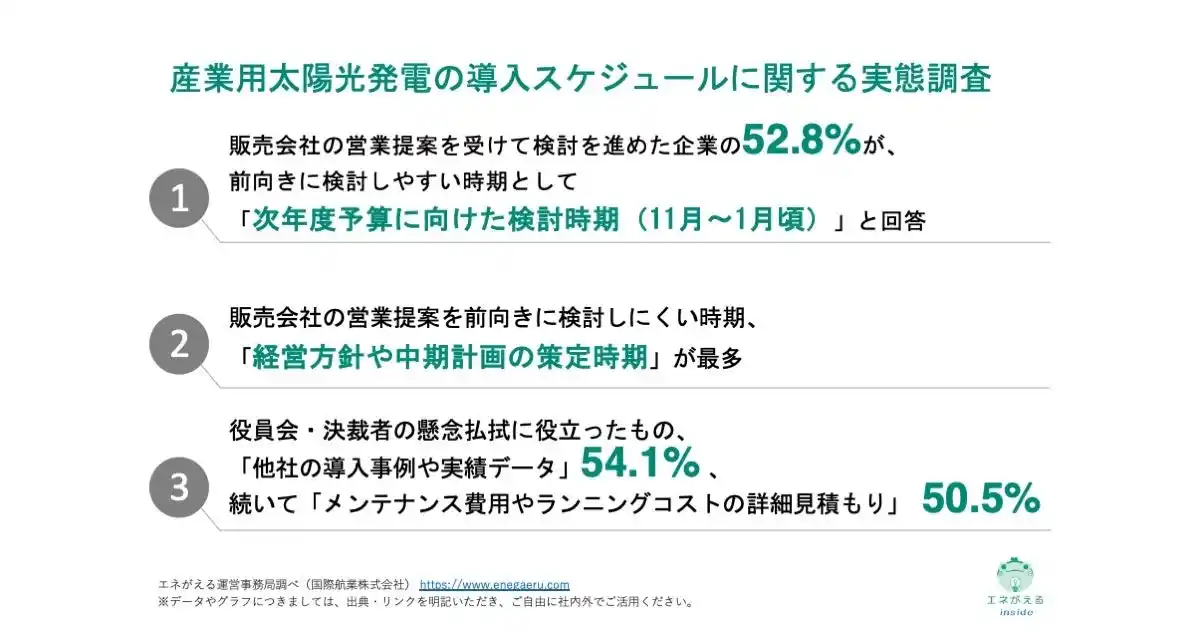 本調査から、産業用太陽光発電の導入は企業の予算サイクルと密接に連動しており、特に次年度予算策定期が意思決定の重要なタイミングであることが明らかになりました。経営層の承認がボトルネックとなりやすい中、販売会社には検討初期の段階から導入事例やコスト情報など、決裁者の懸念を先回りして解消できる具体的な資料の提供が求められるでしょう。 |