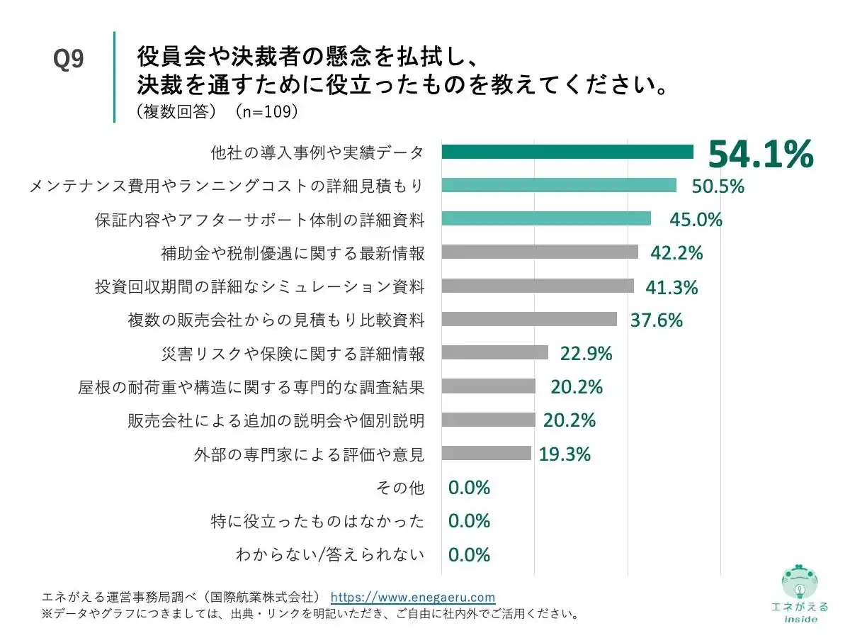 Q9. Q8で「特にない」「わからない/答えられない」以外を回答した方にお聞きします。役員会や決裁者の懸念を払拭し、決裁を通すために役立ったものを教えてください。(複数回答) |