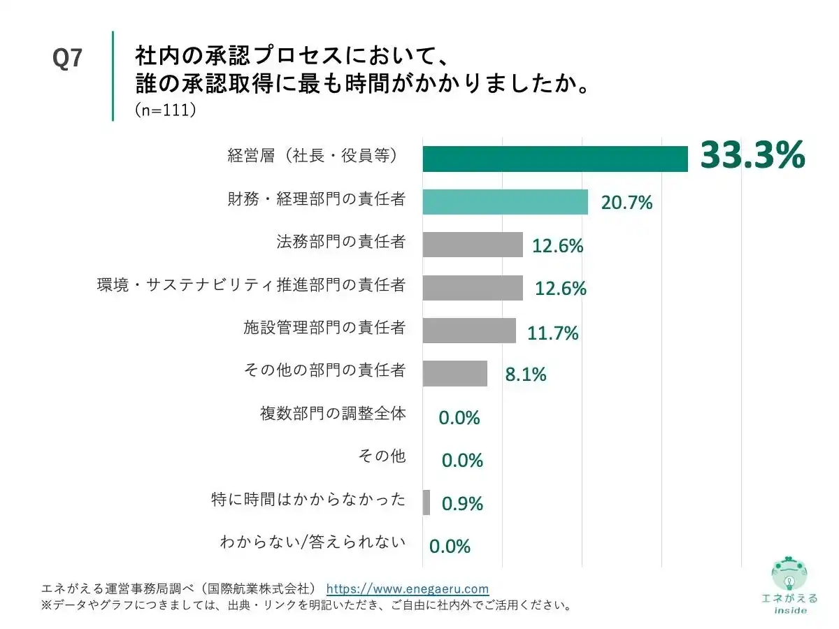 「Q7. 社内の承認プロセスにおいて、誰の承認取得に最も時間がかかりましたか。」(n=111)と質問したところ、「経営層(社長・役員等)」が33.3%、「財務・経理部門の責任者」が20.7%という回答になりました。 |