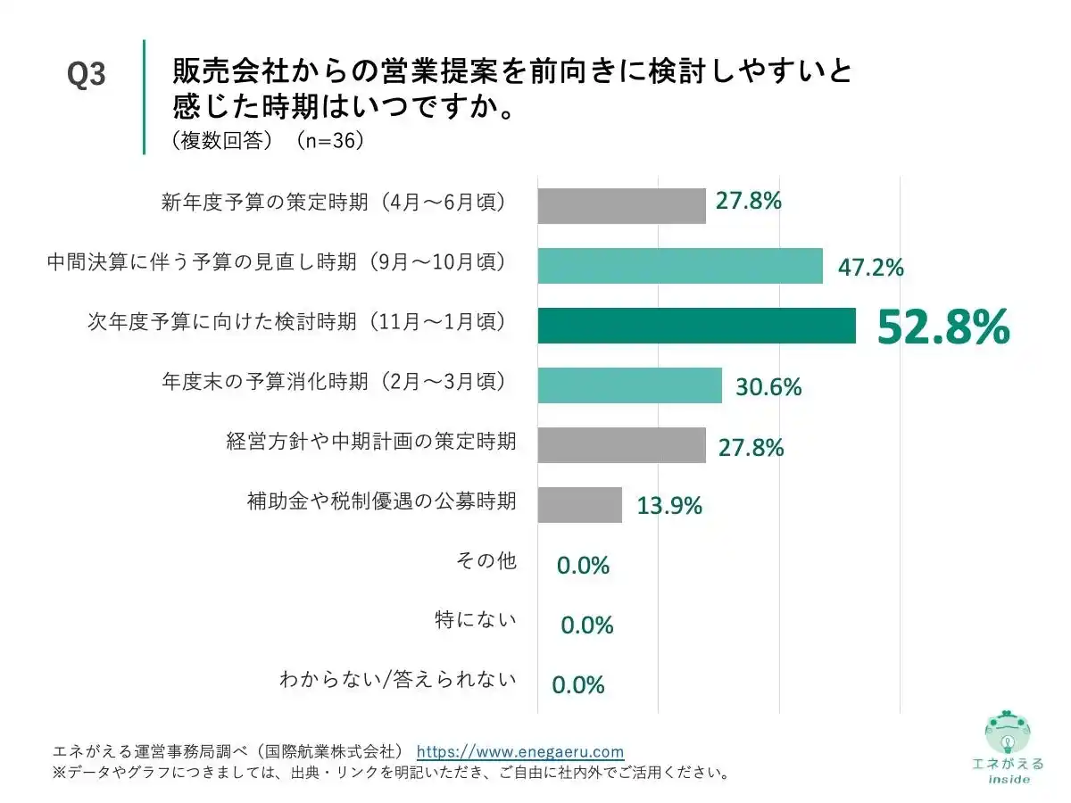「Q3. Q2で「販売会社からの営業提案を受け、その後に社内検討を進めた」「自社での検討と、販売会社からの提案がほぼ同じ時期に進んだ」と回答した方にお聞きします。販売会社からの営業提案を前向きに検討しやすいと感じた時期はいつですか。(複数回答)」(n=36)と質問したところ、「次年度予算に向けた検討時期(11月~1月頃)」が52.8%、「中間決算に伴う予算の見直し時期(9月~10月頃)」が47.2%、「年度末の予算消化時期(2月~3月頃)」が30.6%という回答になりました。 |