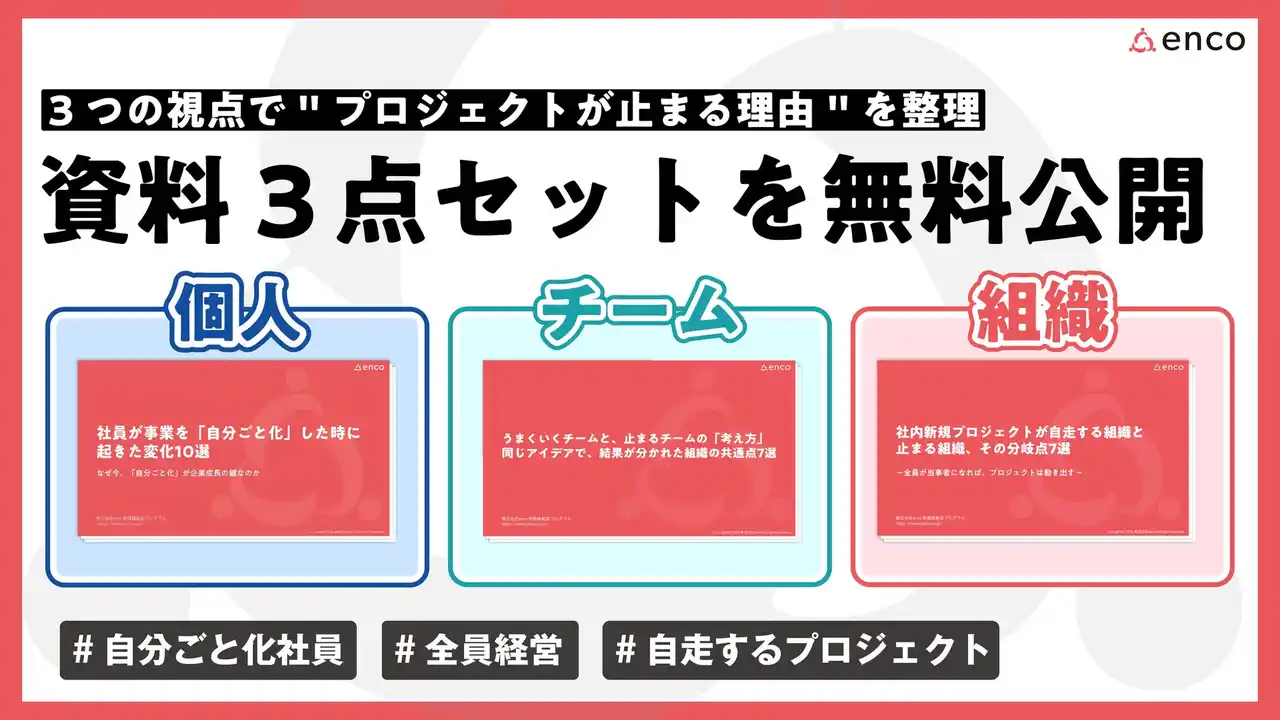 社内プロジェクトの停滞や社員の当事者意識の不足が多くの企業で共通課題となる中、「自分ごと化」を軸にした人材育成・組織開発を展開する株式会社enco(本社:愛知県名古屋市西区那古野二丁目14番1号、代表取締役:小林延光、以下「enco」)は、これまでに公開してきた3本のホワイトペーパーを一括でダウンロードできる資料セット『自走する組織のつくりかた 完全セット』を本日公開いたしました。 |