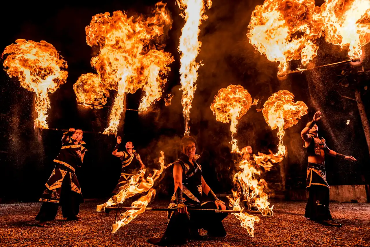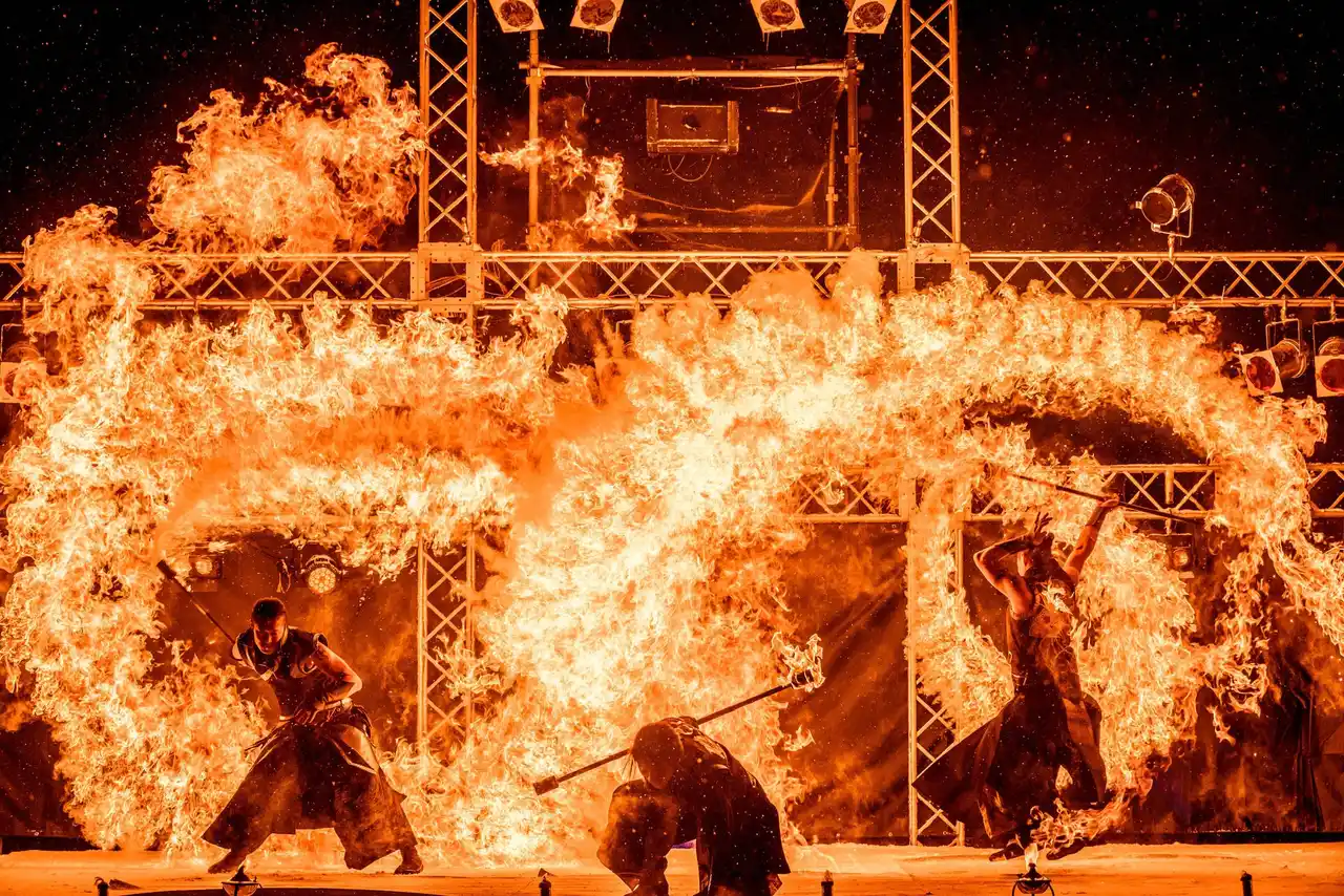 LEDやレーザーなどの光演出と、伝統的なファイヤーパフォーマンスを融合させた |