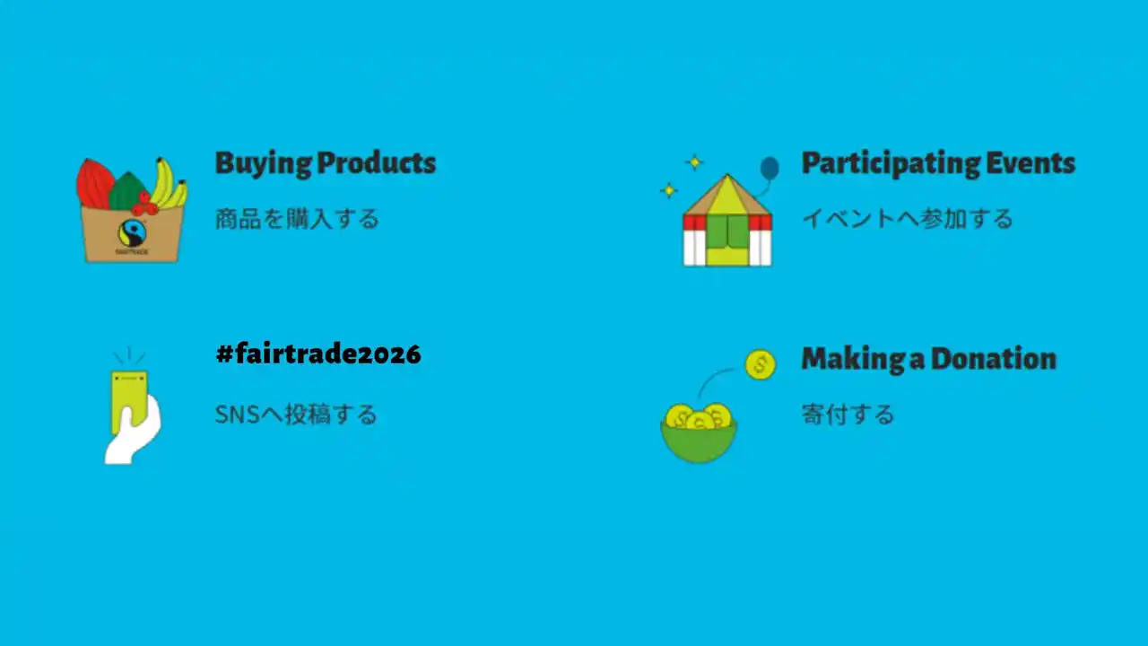 参加方法:フェアトレード商品の購入、#フェアトレード2026 のSNS投稿、全国のフェアトレード関連イベントへの参加、フェアトレード・ラベル・ジャパンへの寄付、登録レストランでのフェアトレードドリンク・フード購入など、フェアトレードに関するアクションを行う |