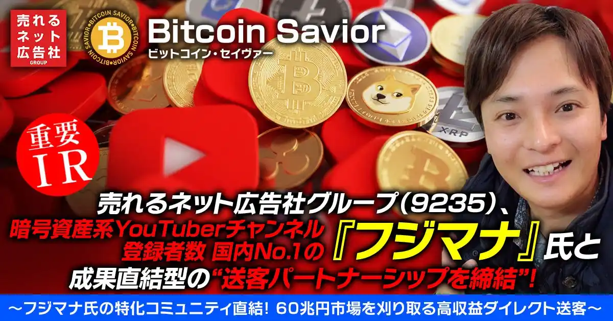 売れるネット広告社グループ株式会社(本社:福岡県福岡市、代表取締役社長 CEO:植木原宗平、東証グロース市場:証券コード9235、以下 売れるネット広告社グループ)は、連結子会社であるビットコイン・セイヴァー株式会社が提供する暗号資産(仮想通貨)復旧サービスにおいて、暗号資産系YouTuberチャンネル登録者数