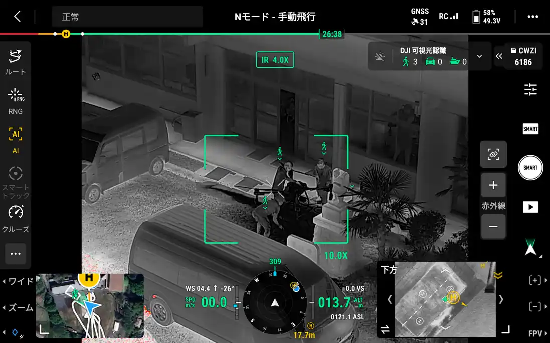 | 機体に標準で搭載されている検知可能な物は現時点で「人・車・船舶」です。検知はドローンのワイド・ズーム・赤外線カメラで検知が可能です。※本クマAI検知は現在赤外線カメラ未対応です。 | |||||||||||||||||||