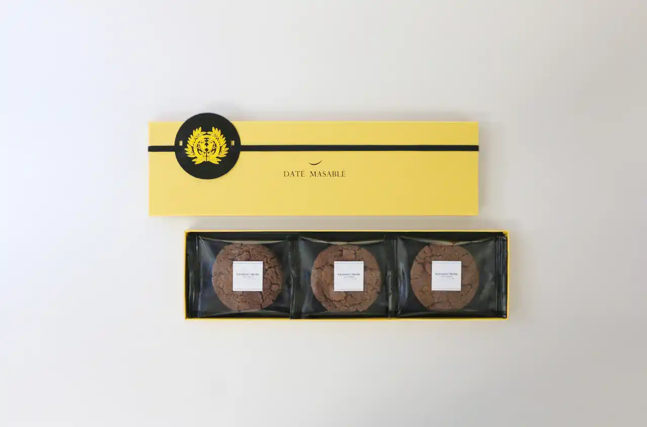伊達家の家紋が描かれたパッケージで、お土産に最適です。まろやかで旨味のある『伊達の旨塩』を使用。バランスの取れた塩気と甘味があと引くおいしさの、伊達政宗の眼帯をイメージしたチョコレートサブレです。 |