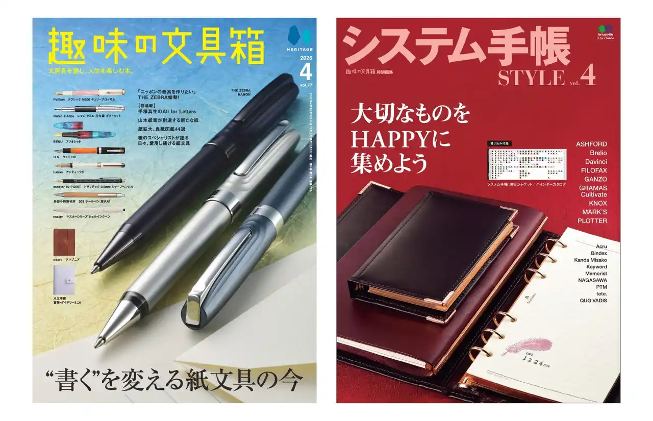 手で書くことの楽しさ、書く道具としての文房具の魅力を発信している季刊雑誌。よい文具や人気の筆記具は機能的でアナログな趣に溢れ、歴史に培われた魅力があります。筆記具の多彩な魅力を若者から大人まで広い世代の文具ファンに向け、万年筆や美しく機能的な文具を趣味と実用の視点から紹介しています。年に4回(3・6・9・12月)発刊しています。 |