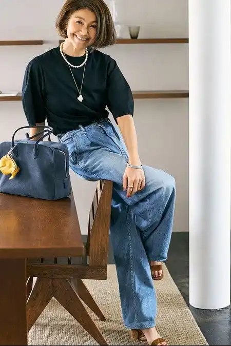 3.デニム×Tシャツのシンプルコーデも1枚でこなれた印象に ウエストインした時に、ちょうど袖の部分がウエストラインと揃ってくれるので、デニム×Tシャツの超シンプルコーデもこなれた印象に。 |