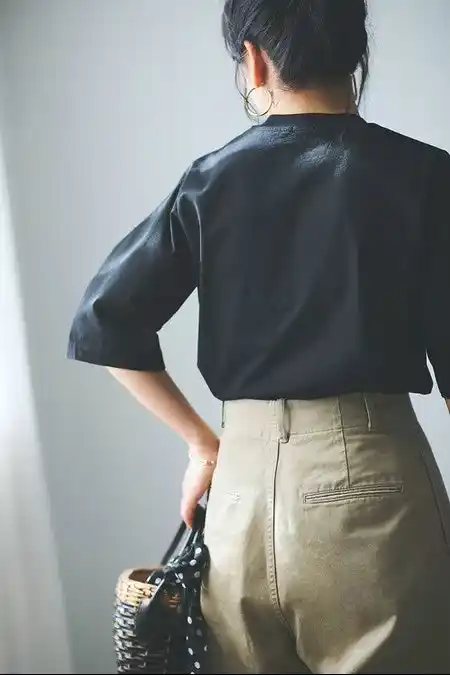 このデザインのおかげで女性らしく仕上げてくれますし、Tシャツが本来持っている“気軽さ”はありつつ、ブラウスほど大袈裟にならないのもポイントです。 |