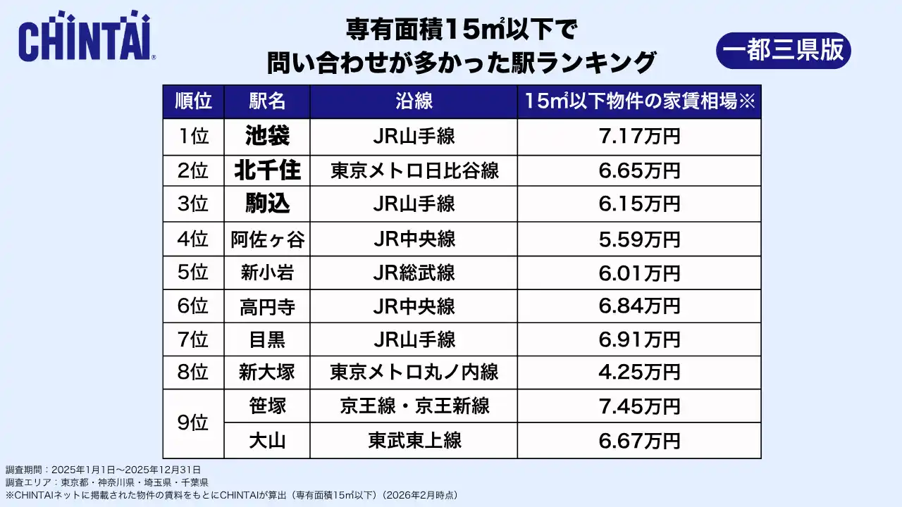 お部屋探しのリーディングカンパニー株式会社CHINTAI(本社:東京都港区 代表取締役社長 奥田倫也、以下CHINTAI)は、『CHINTAIネット』に掲載された東京都、神奈川県、埼玉県、千葉県の賃貸物件のうち、専有面積が15平方メートル 以下および45平方メートル 以上の物件において問い合わせが多かった駅を集計し、それぞれランキング化しました。 |