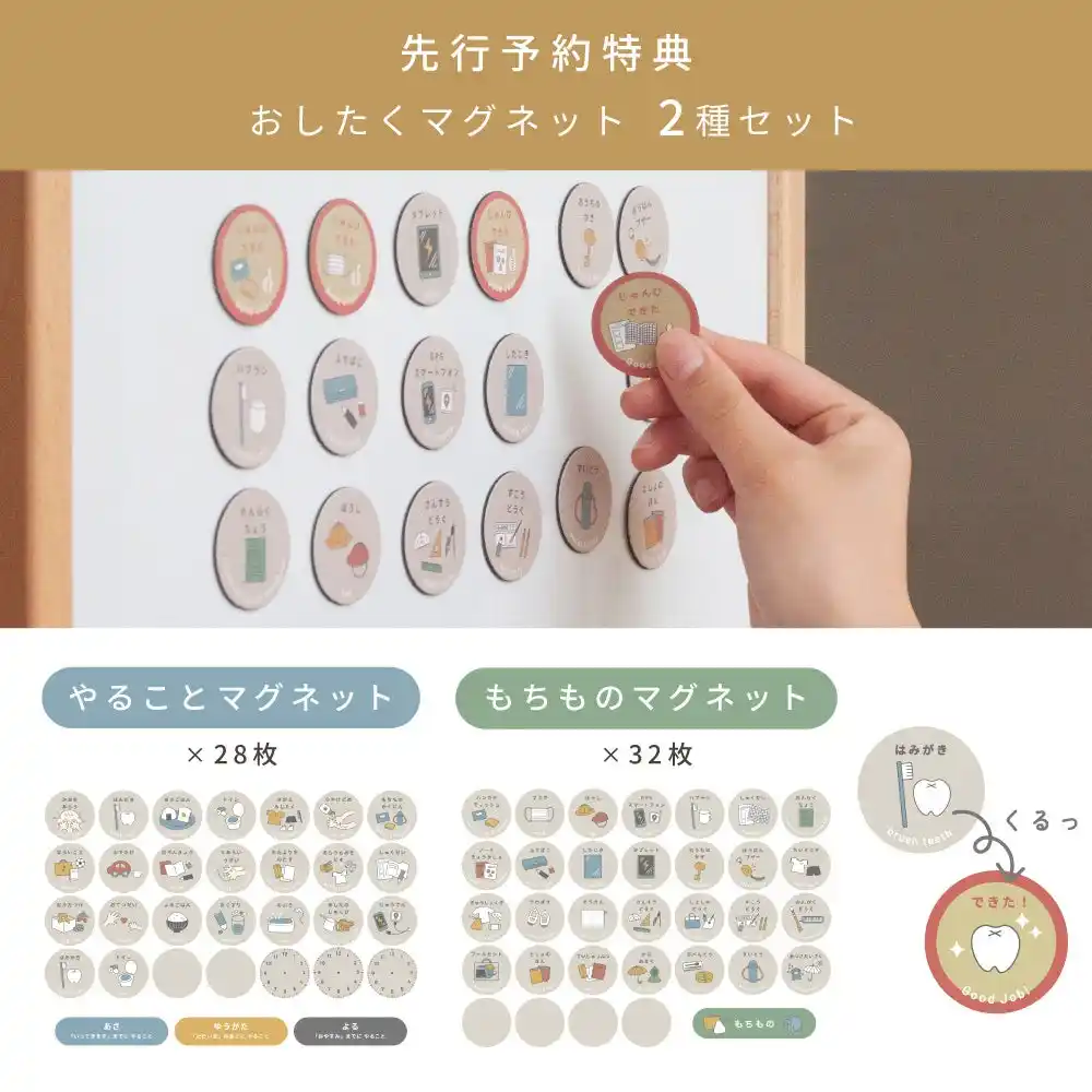 また予約特典として、子どもの生活習慣をサポートする「おしたくマグネット(2種)」を進呈いたします。 |