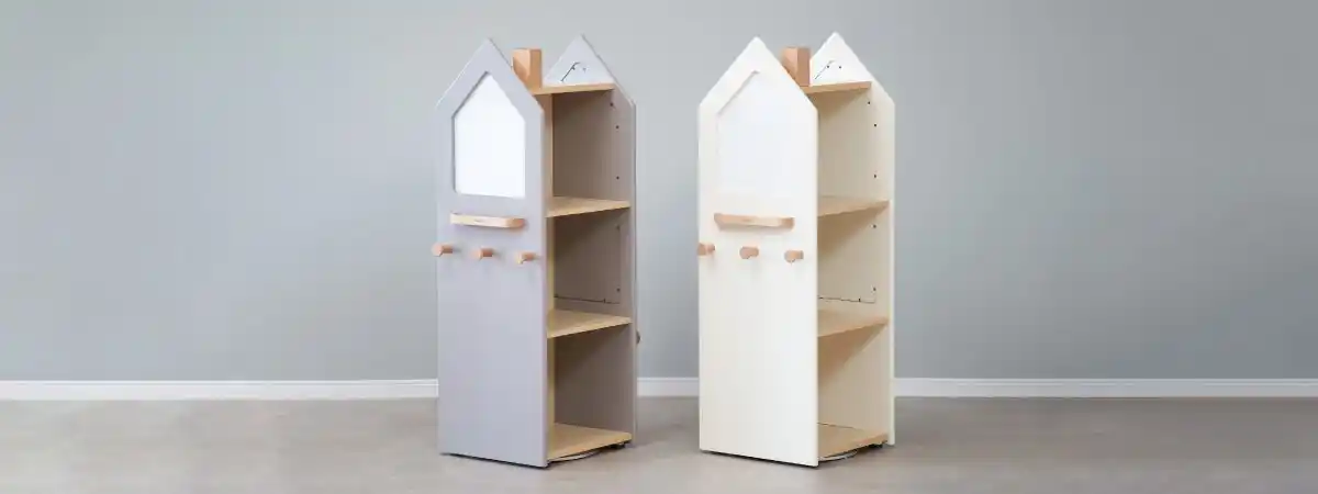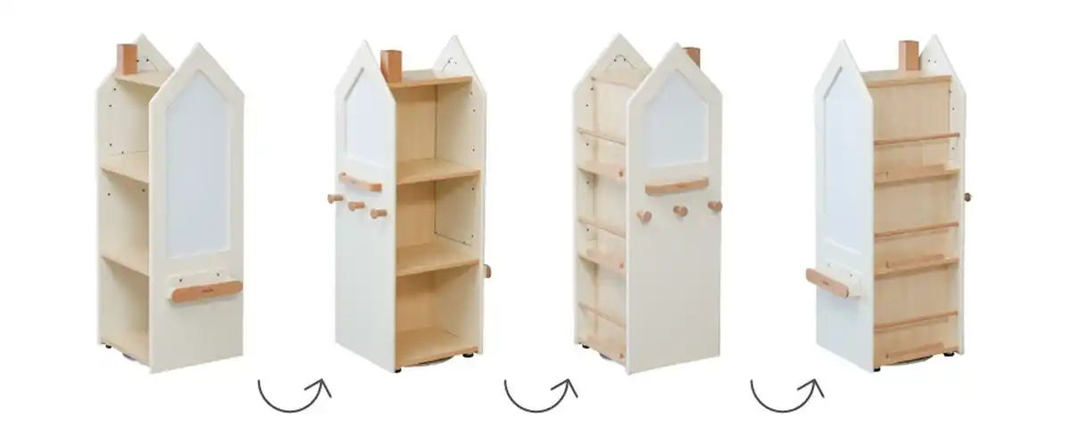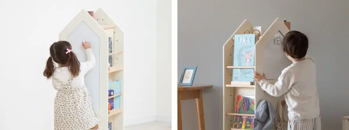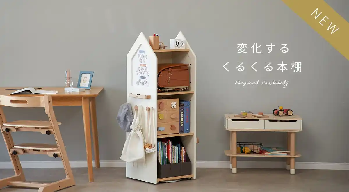 「変化するくるくる本棚」は、収納棚・ホワイトボード・かばん掛けをひとつにまとめた、 おうち型の回転収納ラックです。 毎日の「おしたく」をスムーズにしながら、親子のコミュニケーションも自然と生まれるアイテムです。 |