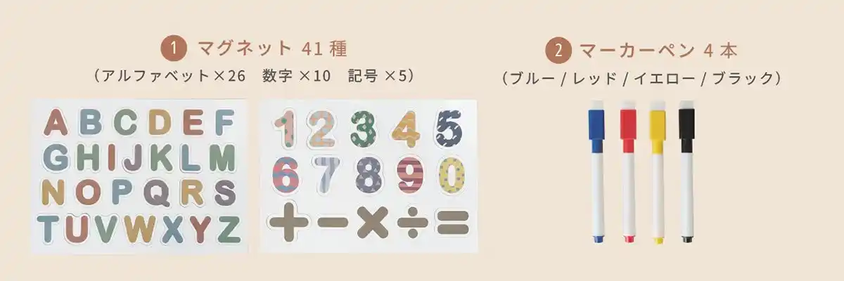 1.マグネット41種つき 付属のアルファベット・数字マグネットで遊びながら楽しく学べる! 計算符号もあるので、算数のお勉強にも 市販のマグネットおもちゃ遊びにもぴったり