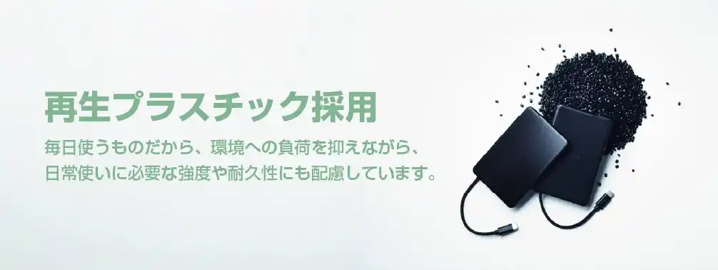環境負荷を抑えるため、筐体には再生プラスチックを採用し、パッケージには、管理された森林から生産された紙を使用しています。 |