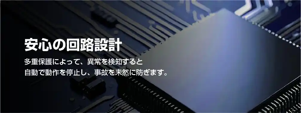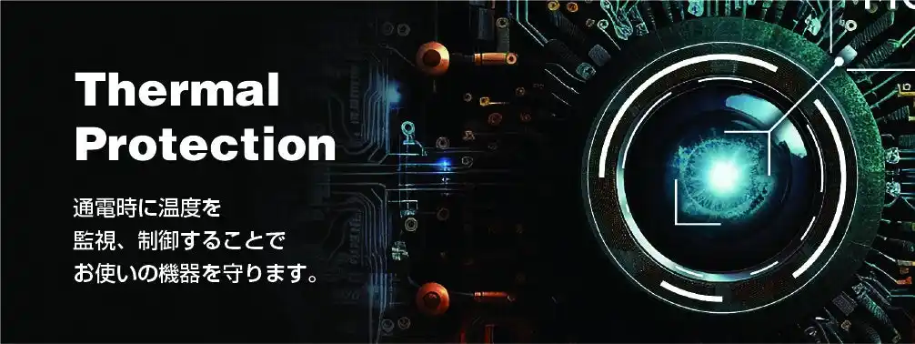 過充電・過放電・過電流防止機能および短絡保護機能と温度検知機能の5つの保護機能を備えた安心の回路設計です。さらにThermal Protectionを搭載し、通電時に温度を監視・制御することで、お使いの機器を守ります。 |